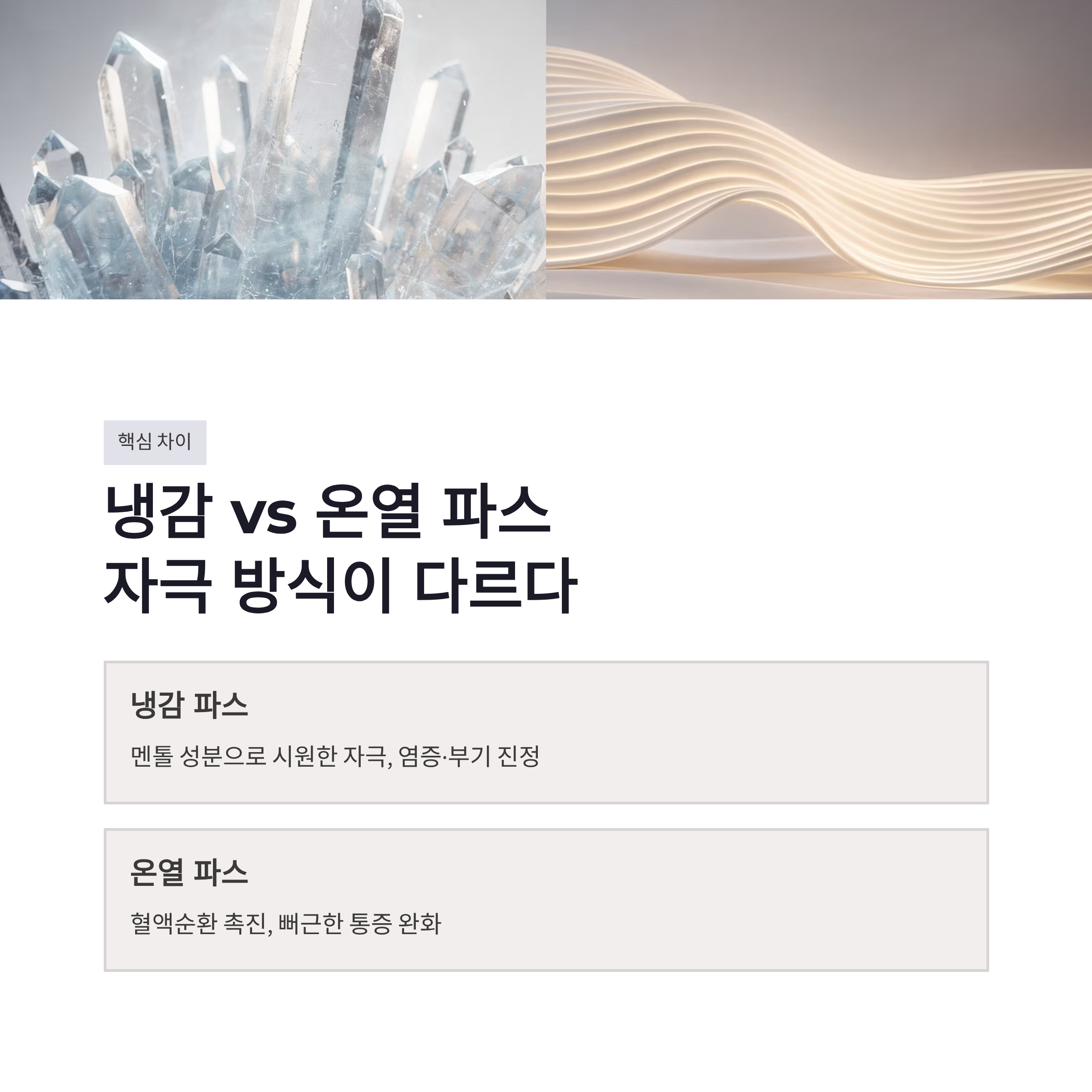 일단 핵심부터요. 냉감 파스랑 온열 파스 차이는 자극 방식이에요. 냉감 파스는 멘톨 성분으로 시원한 자극을 주면서 염증과 부기를 가라앉히는 데 초점이 맞춰져 있고, 온열 파스는 혈액순환을 도와서 뻐근한 통증을 풀어주는 쪽이에요.