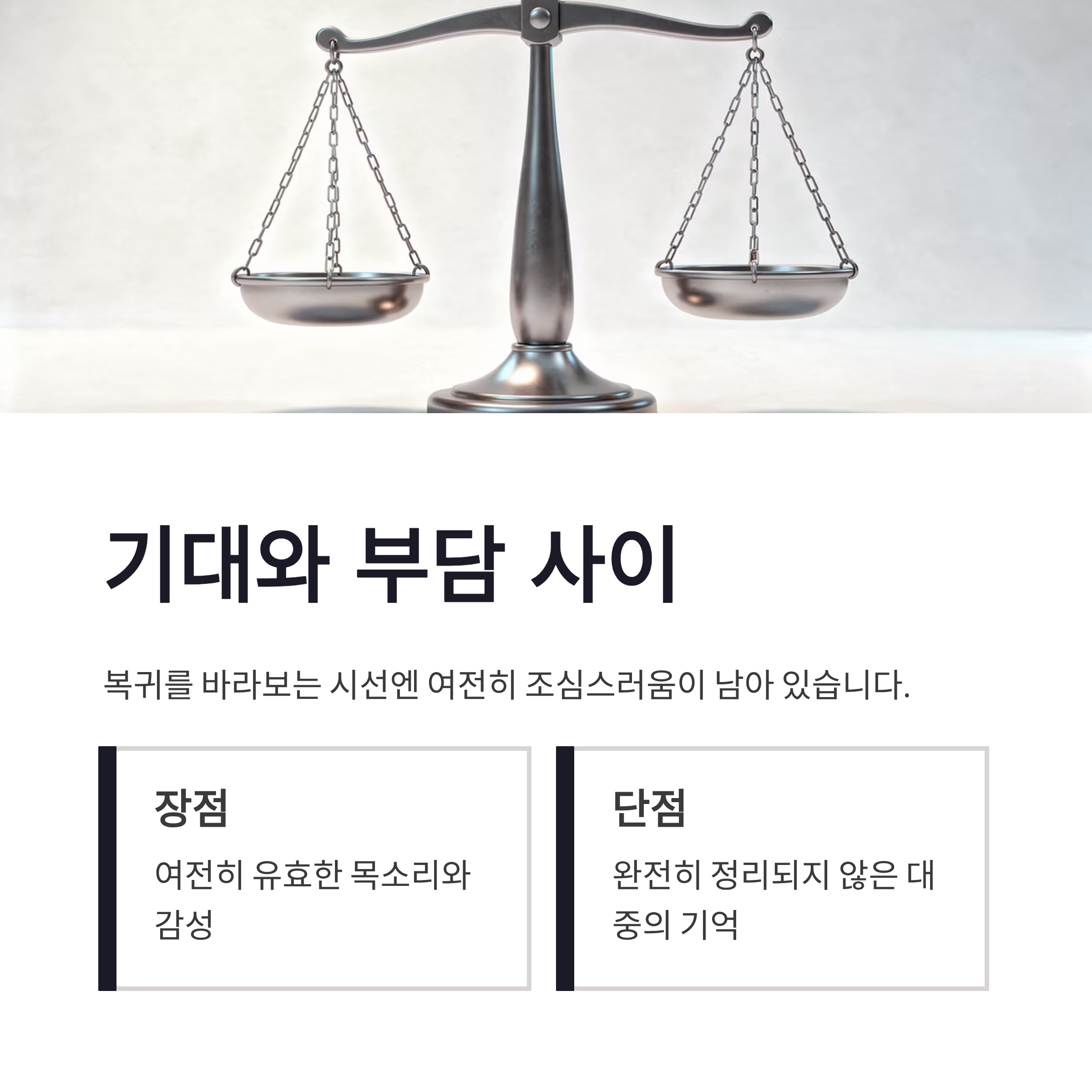 김건모 복귀를 바라보는 시선엔 여전히 조심스러움이 남아 있습니다. 논란이 종지부를 찍었다고는 하지만, 김건모 복귀 이후 활동이 예전처럼 자유롭긴 쉽지 않겠죠. 장점이라면, 그의 목소리와 감성은 여전히 유효하다는 점입니다. 반면 단점은, 대중의 기억이 아직 완전히 정리되지 않았다는 부분이구요. 2026년 기준 대중문화 트렌드는 완벽함보다 진정성을 더 중요하게 보는데, 김건모 복귀는 그 기준에선 오히려 시험대에 오른 느낌이었습니다. 무리한 방송보단 음악 중심의 조심스러운 행보가 더 어울리지 않을까 싶더라구요.
