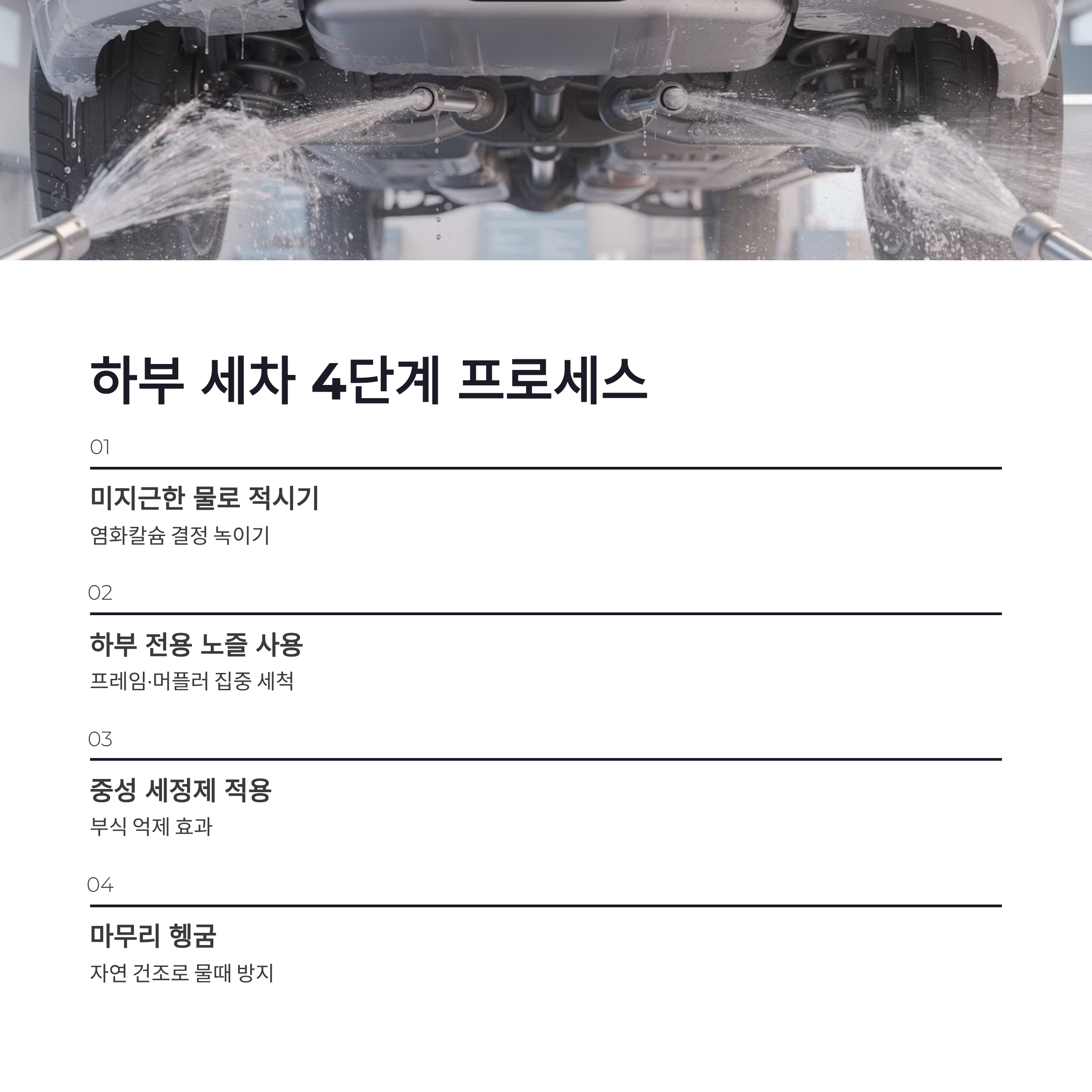 | 단계 | 하부 세차 포인트 | 체감 효과 | | -- | -------------------- | ----------- | | 1 | 미지근한 물로 하부 충분히 적시기 | 염화칼슘 결정 녹이기 | | 2 | 하부 전용 노즐로 프레임·머플러 집중 | 잔여물 제거 | | 3 | 중성 세정제 사용 (선택) | 부식 억제 | | 4 | 마무리 헹굼 + 자연 건조 | 물때 방지 |