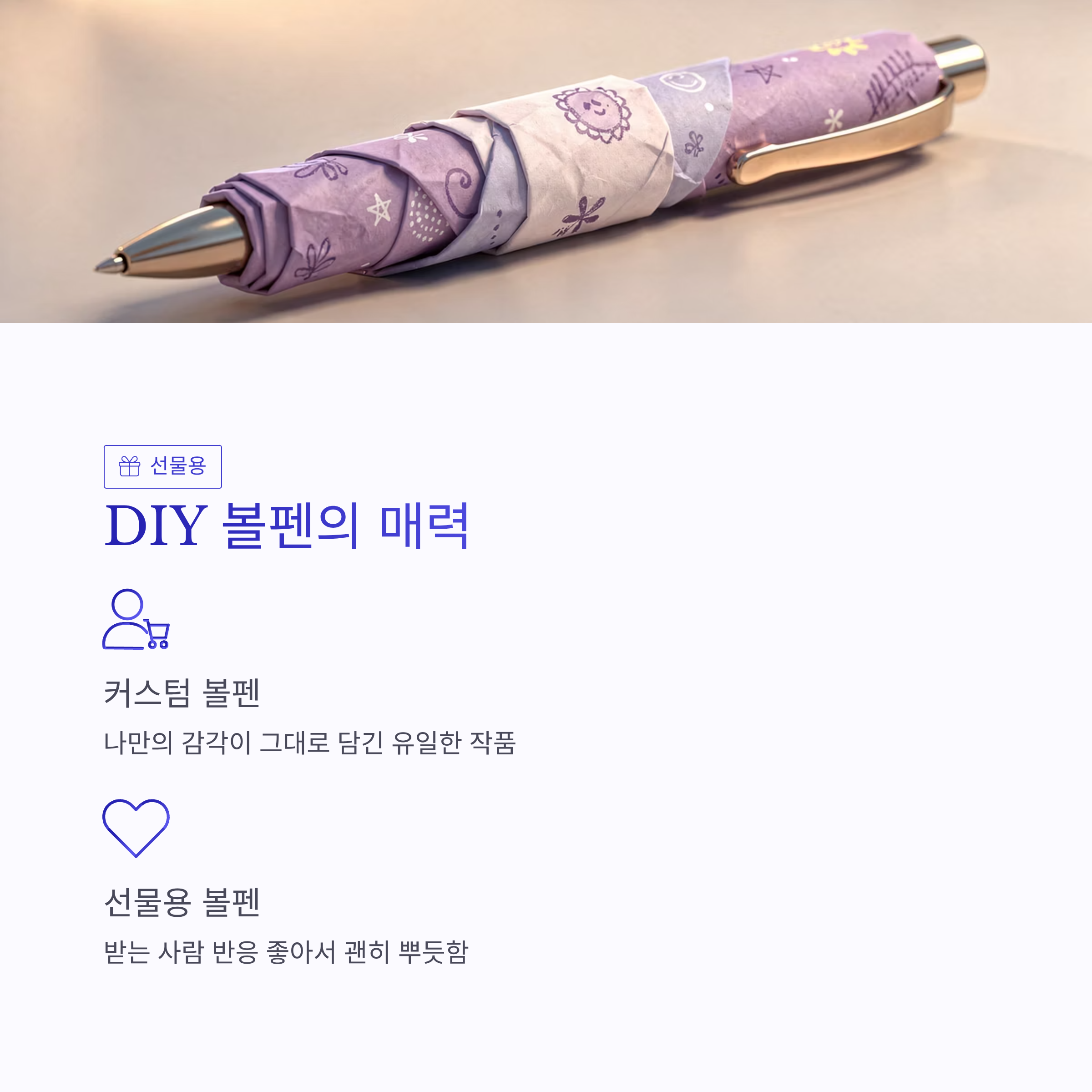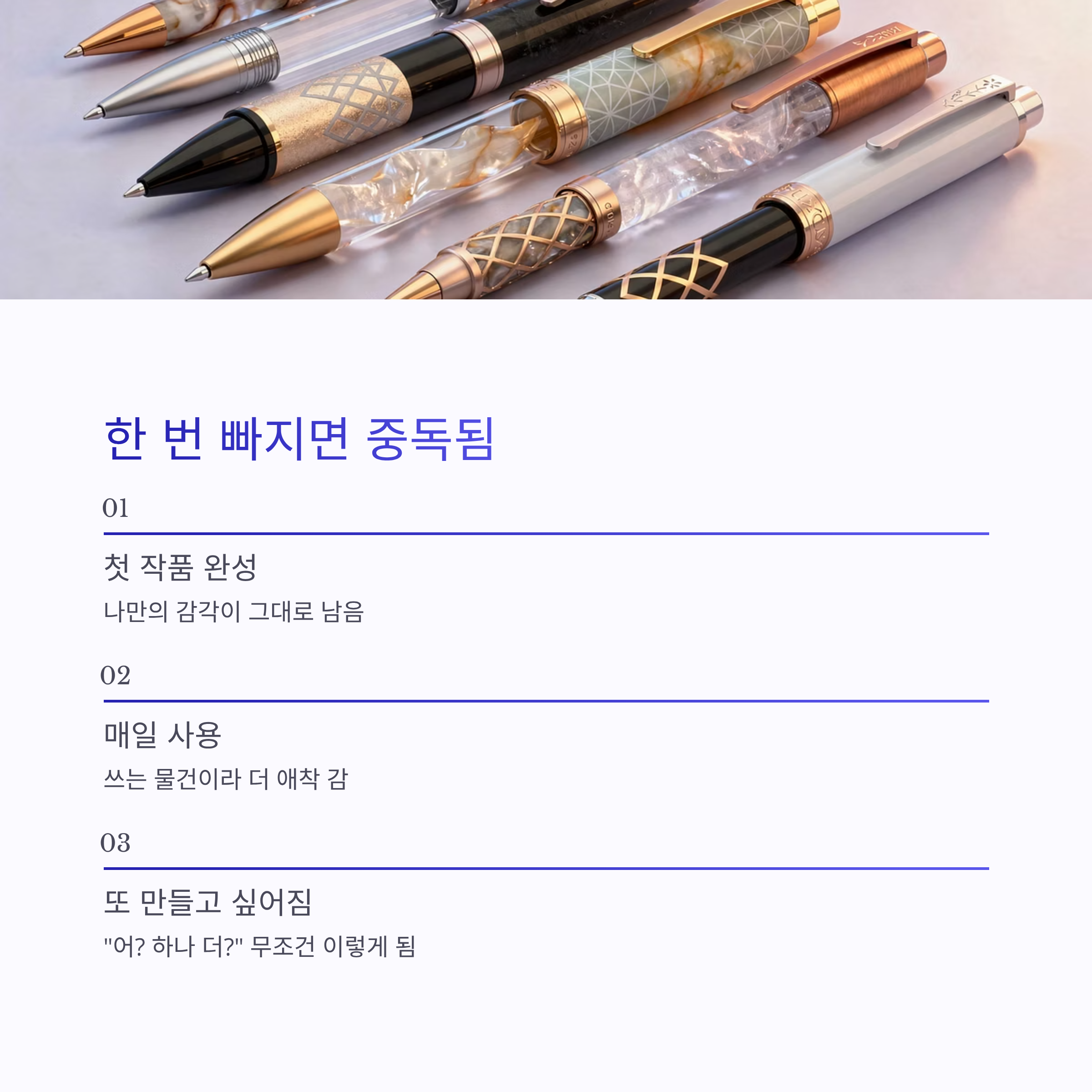 연관 키워드로 많이들 찾는 게 *DIY 볼펜*, *커스텀 볼펜*, *선물용 볼펜* 이런 건데, 실제로 만들어보니까 선물용으로도 꽤 괜찮더라구요. 받는 사람 반응이 좋아서 괜히 뿌듯했음다.