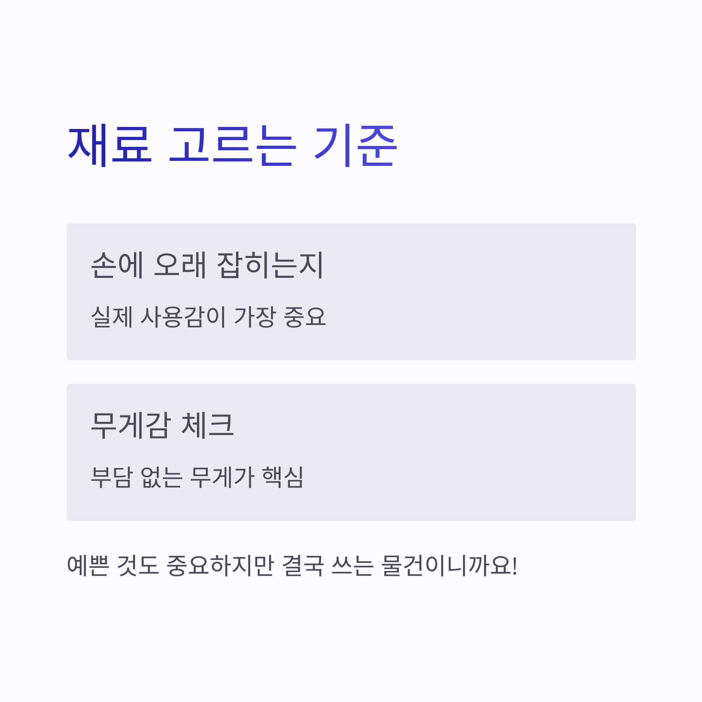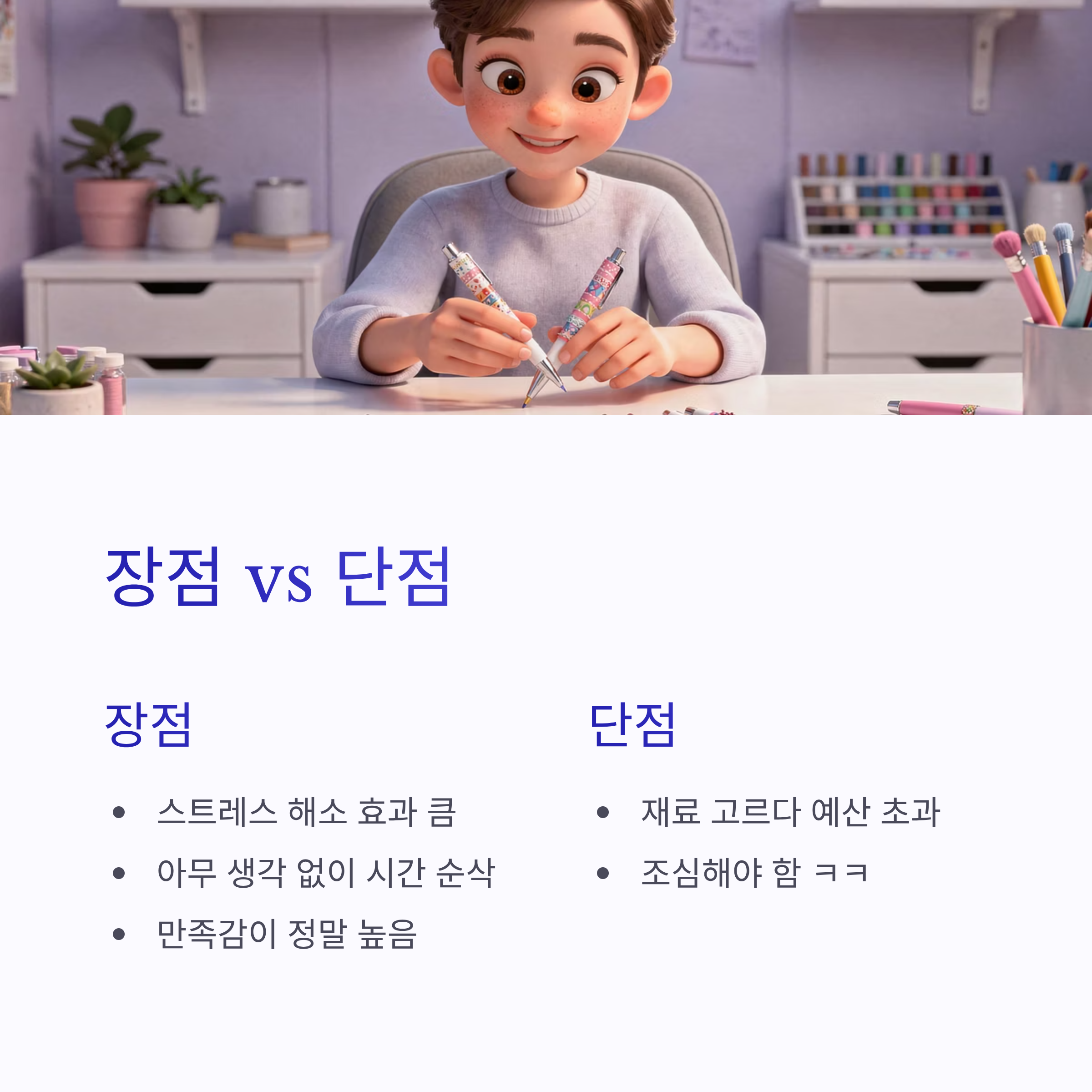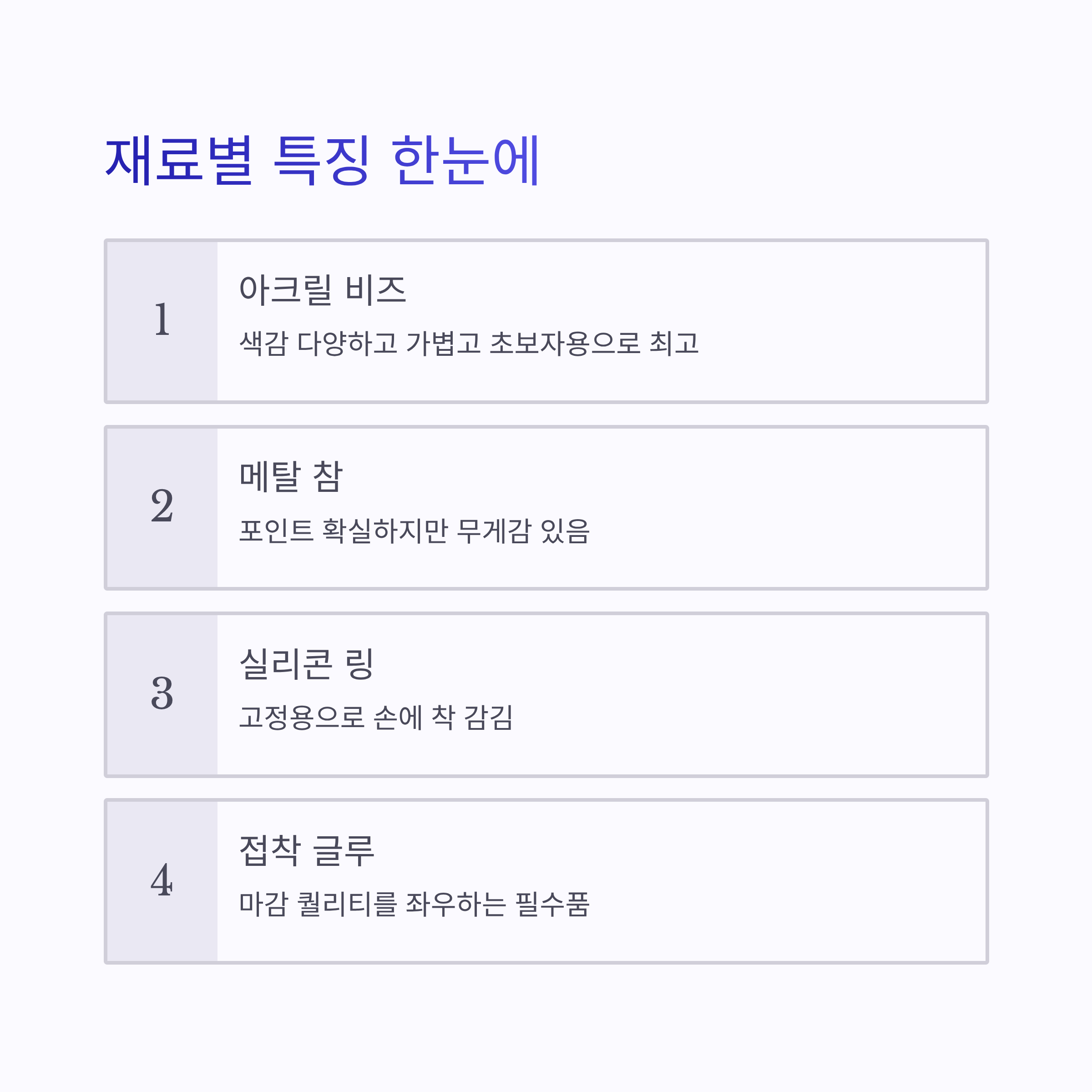 처음엔 뭐가 뭔지 정신없어요. 그래서 저는 기준을 딱 정했어요. *손에 오래 잡히는지*, *무게감이 부담 없는지* 이 두 개요. 동대문 볼펜꾸미기는 예쁜 것도 중요하지만 결국 쓰는 물건이잖아요. 아래는 제가 직접 써보고 정리한 재료 체감표예요.