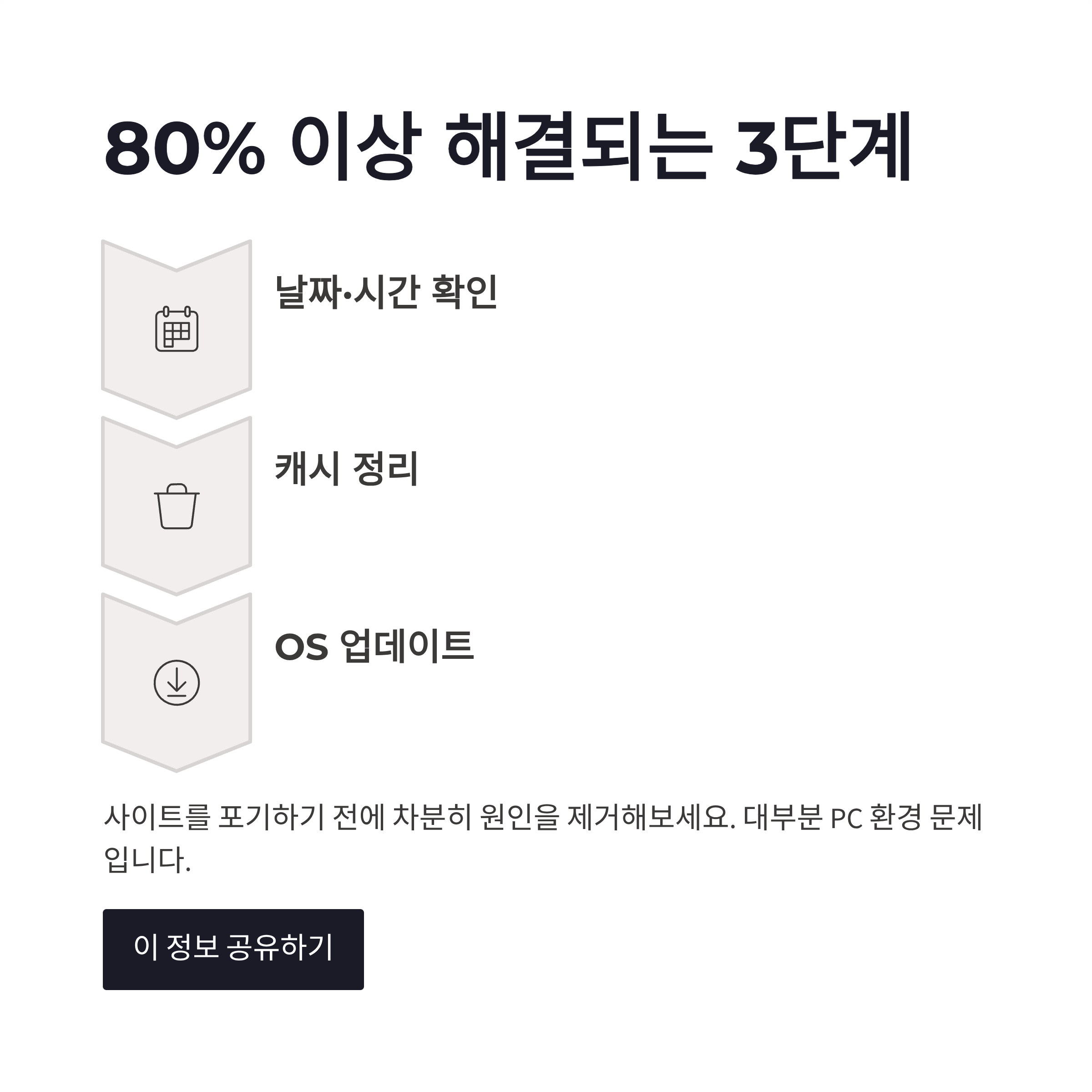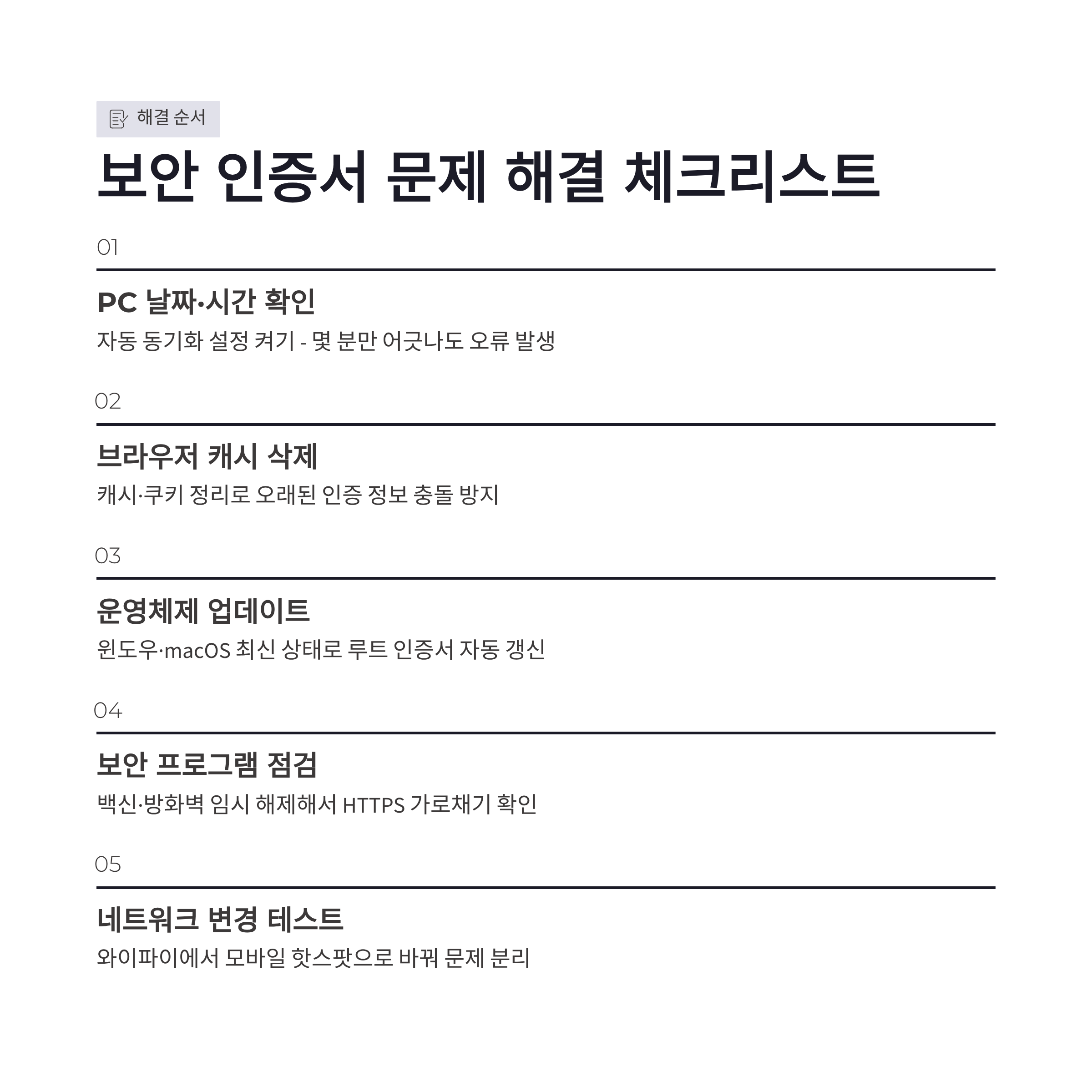 제가 직접 겪으면서 효과 봤던 보안 인증서 문제 해결 순서를 표로 정리해봤습니다. 하나씩만 체크해도 체감상 대부분 해결됐구요.