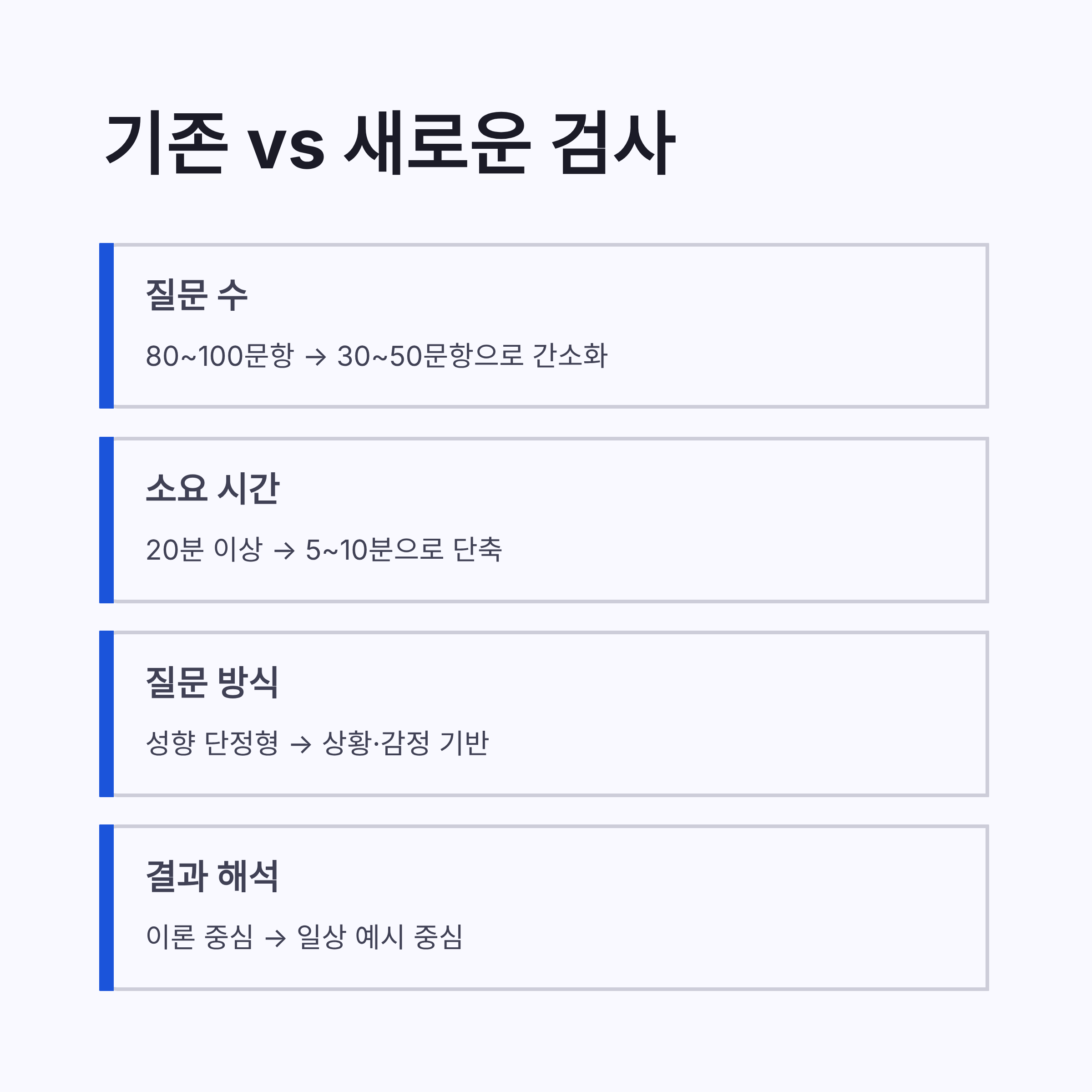 | 구분 | 기존 MBTI 검사 | 새로운 엠비티아이 검사 |