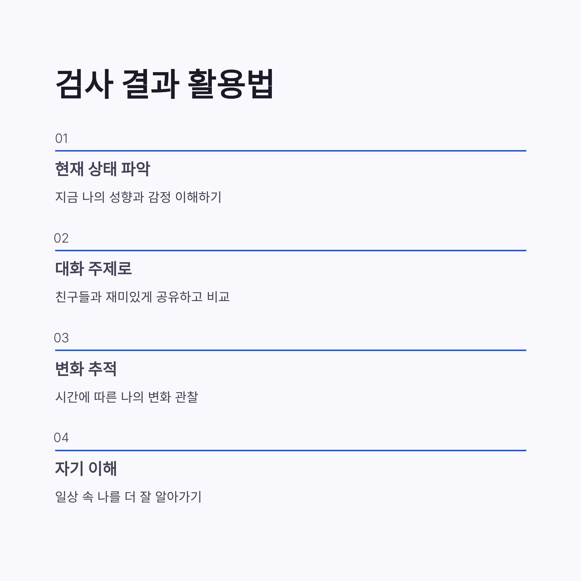 정리해보면, 새로운 엠비티아이 검사 무료 링크는 빠르고 가볍게 현재의 나를 확인하기 딱 좋았어요. MBTI 테스트 결과가 예전이랑 다르다고 해서 이상한 게 아니라, 그만큼 내 상황이 바뀌었다는 신호일 수도 있겠더라구요. 가볍게 재미로 보기도 좋고, 대화 주제로도 최고입니다. 요즘 안 해봤다면 한 번쯤 다시 해보는 거, 은근 추천이에요 ㅎㅎ