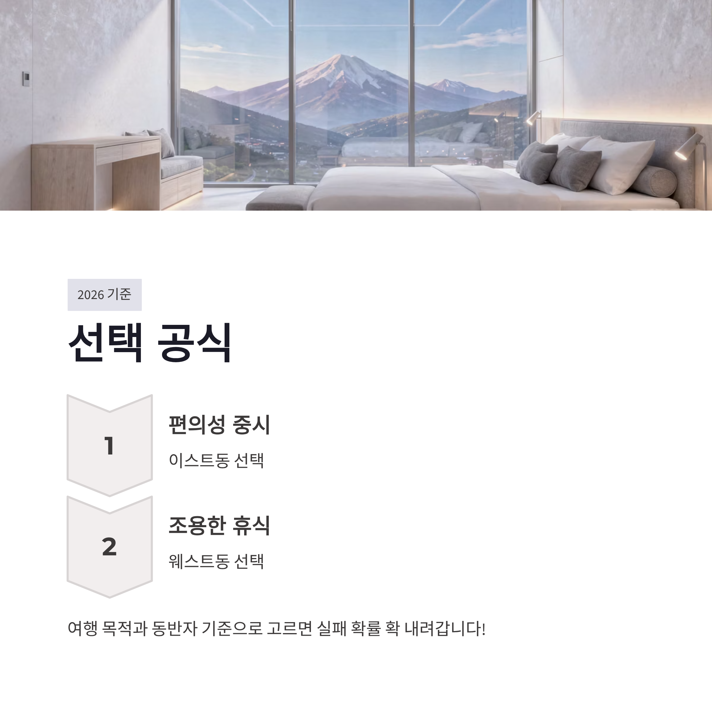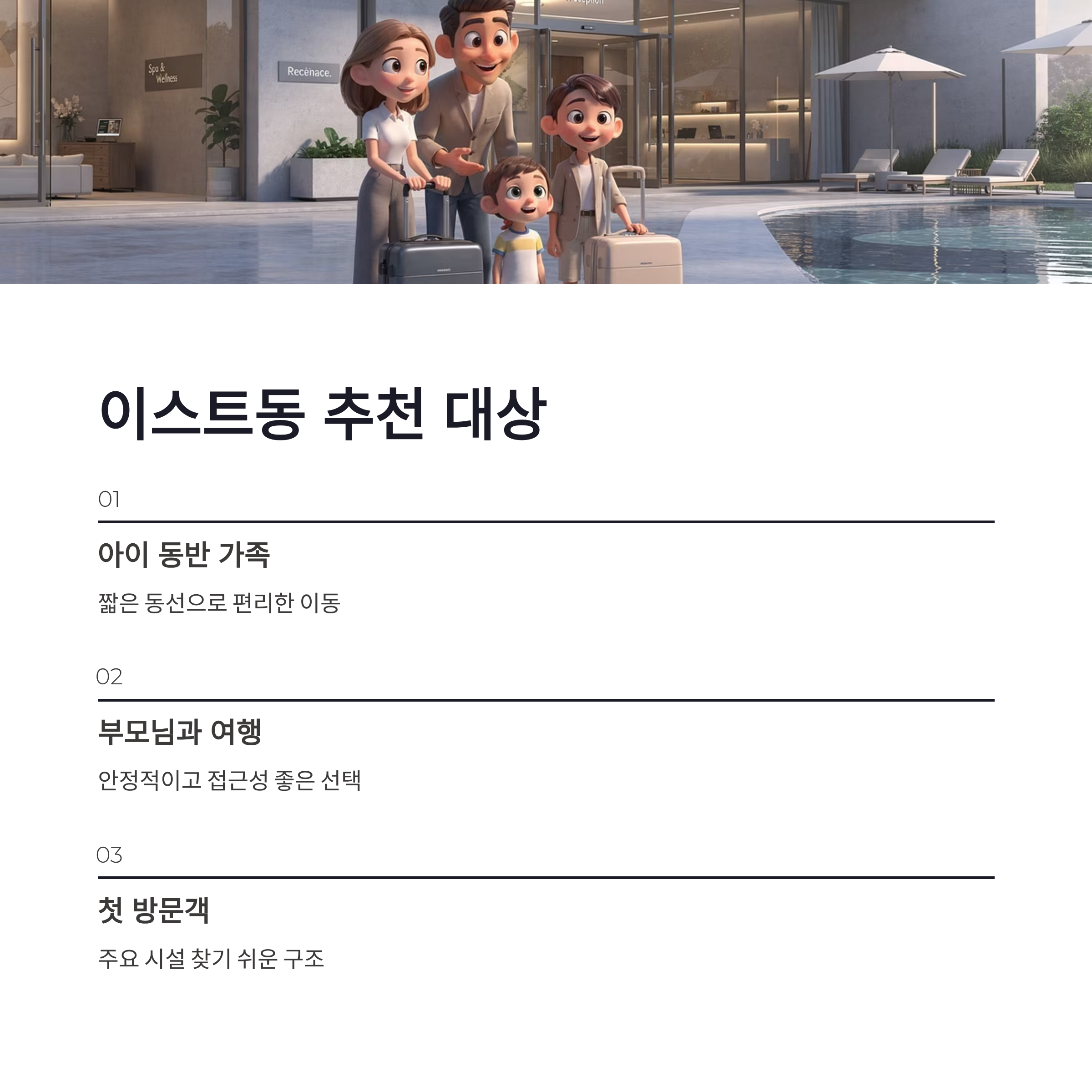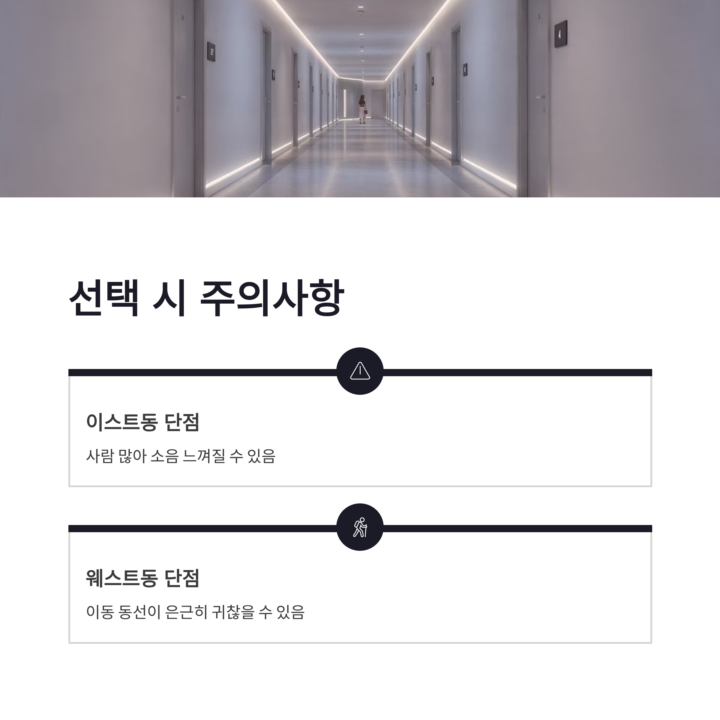 장점만 보면 둘 다 괜찮지만 단점도 분명 있습니다. 이스트동은 사람이 많아 소음이 느껴질 수 있고, 웨스트동은 이동 동선이 은근히 귀찮을 수 있어요. 그래서 “무조건 여기!”보단 일정과 동반자 기준으로 고르는 게 제일 현명하더라구요.