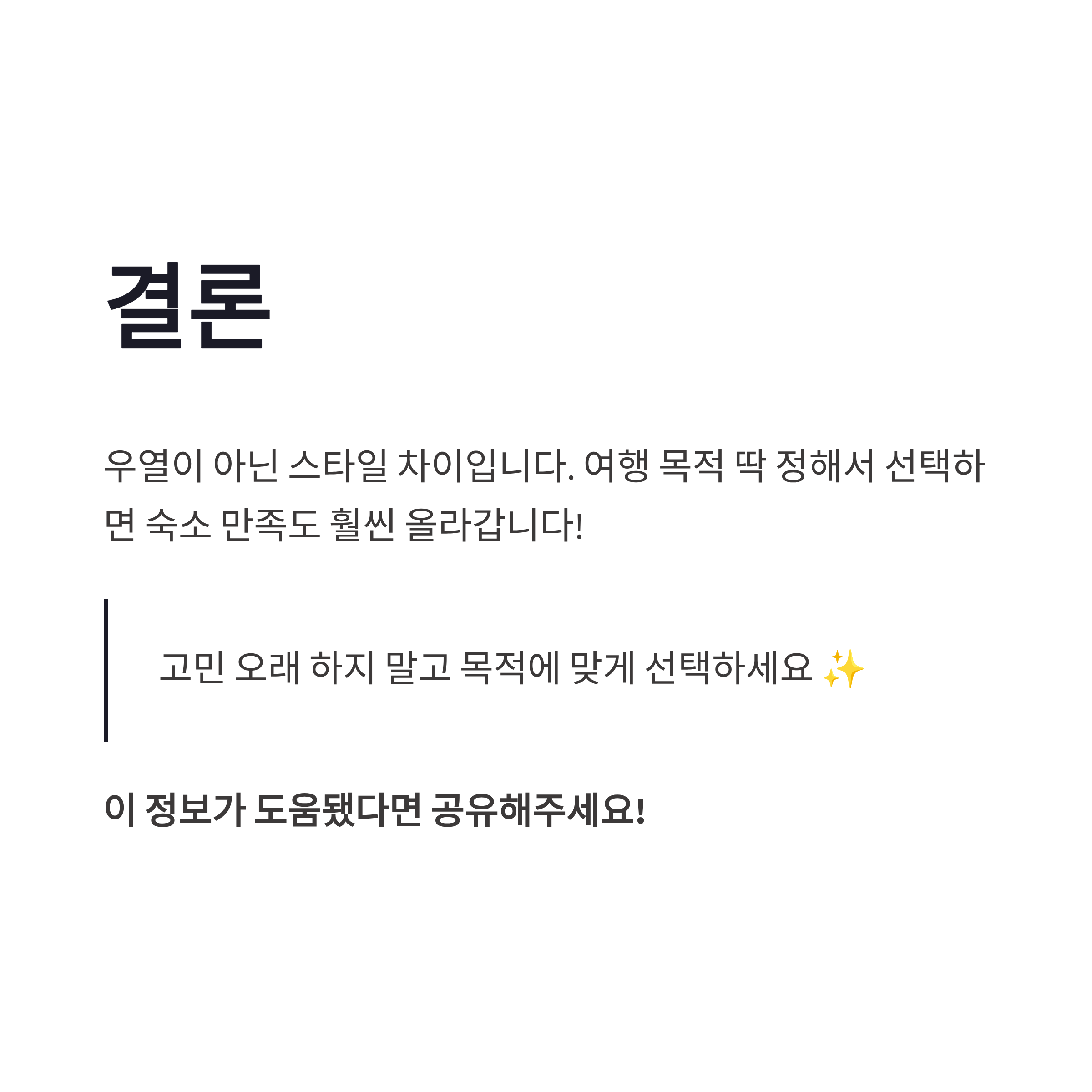 저처럼 고민 오래 하지 말고, 여행 목적 딱 정해서 선택해보세요. 그러면 숙소 만족도 훨씬 올라가더라구요 ㅎㅎ 다음엔 객실 타입별 차이도 한번 정리해볼까 싶은데, 은근 이것도 헷갈리더라구요!