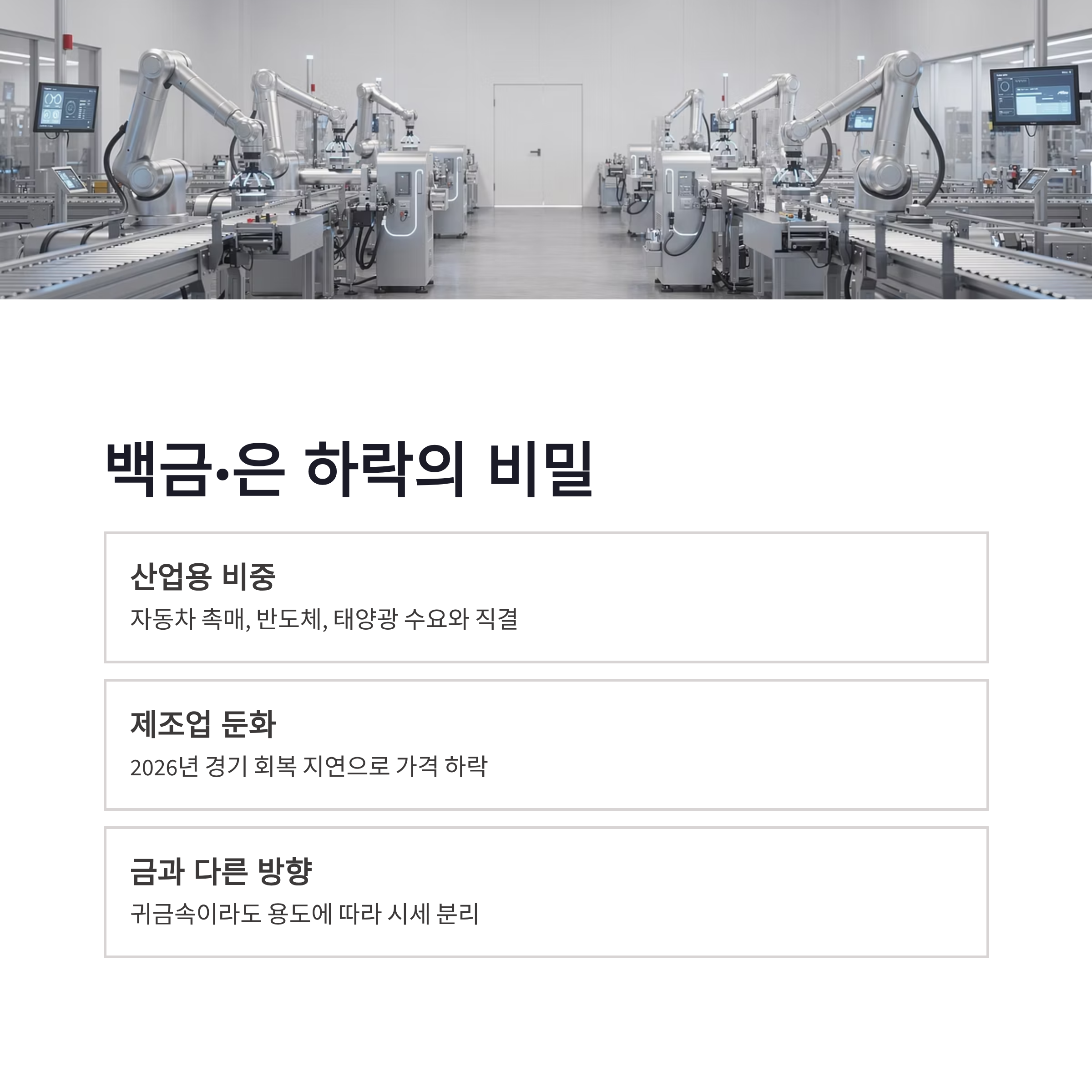 이게 은근 헷갈리는 포인트였는데요. 순금 매입가가 오르는 이유랑, 다른 귀금속이 빠지는 이유가 완전히 다릅니다. 금은 여전히 대표적인 안전자산이라서 지정학적 불안, 금리 인하 기대감만 나와도 바로 반응하구요. 반면 백금이랑 은은 산업용 비중이 큽니다. 자동차 촉매, 반도체, 태양광 쪽 수요가 둔해지면 바로 가격에 티가 나요. 2026년 들어 제조업 경기 회복이 지연되면서 이 부분이 그대로 반영된 상태였슴다. 그래서 지금 흐름만 놓고 보면 귀금속이라고 다 같은 방향은 절대 아니라는 거, 이게 핵심 포인트였어요.