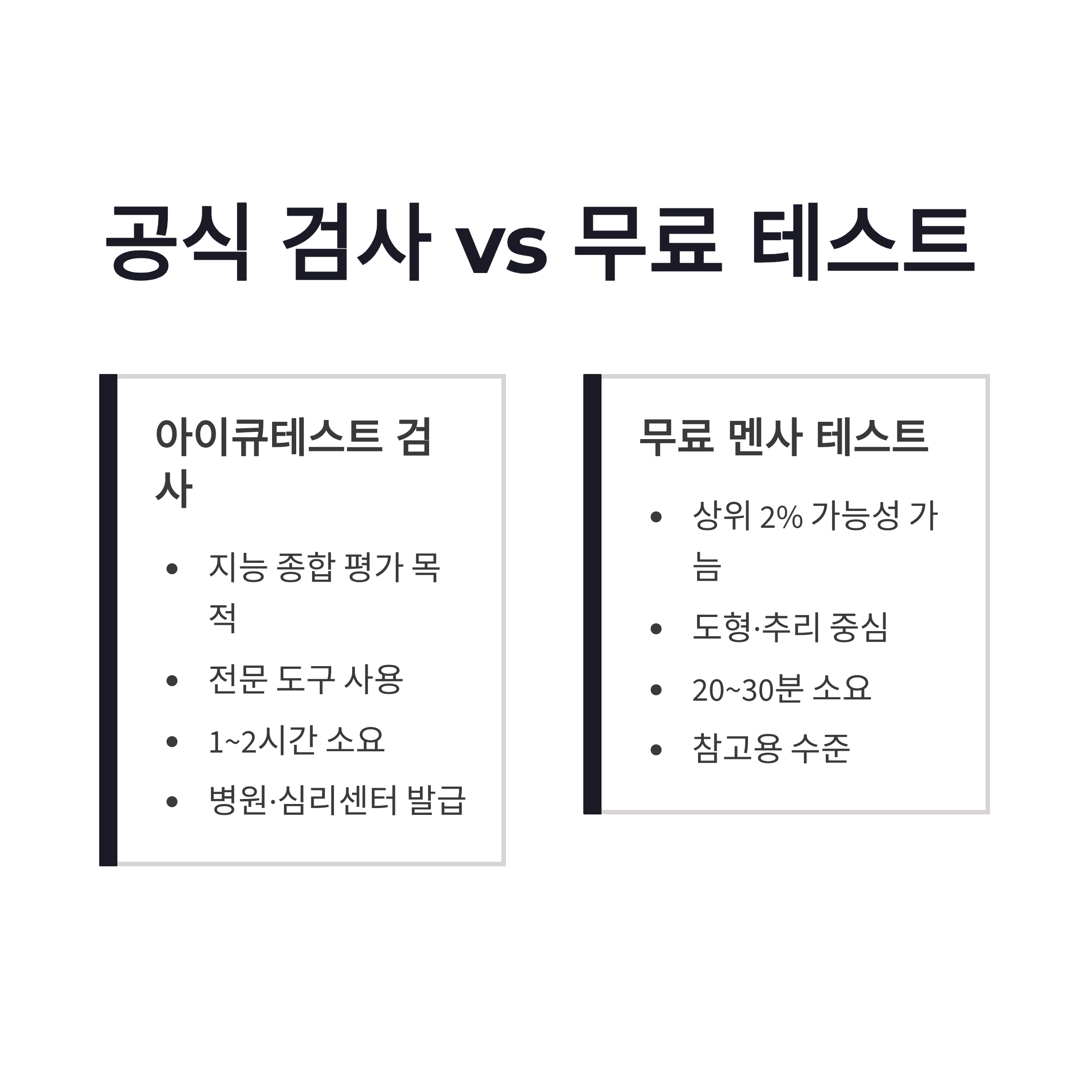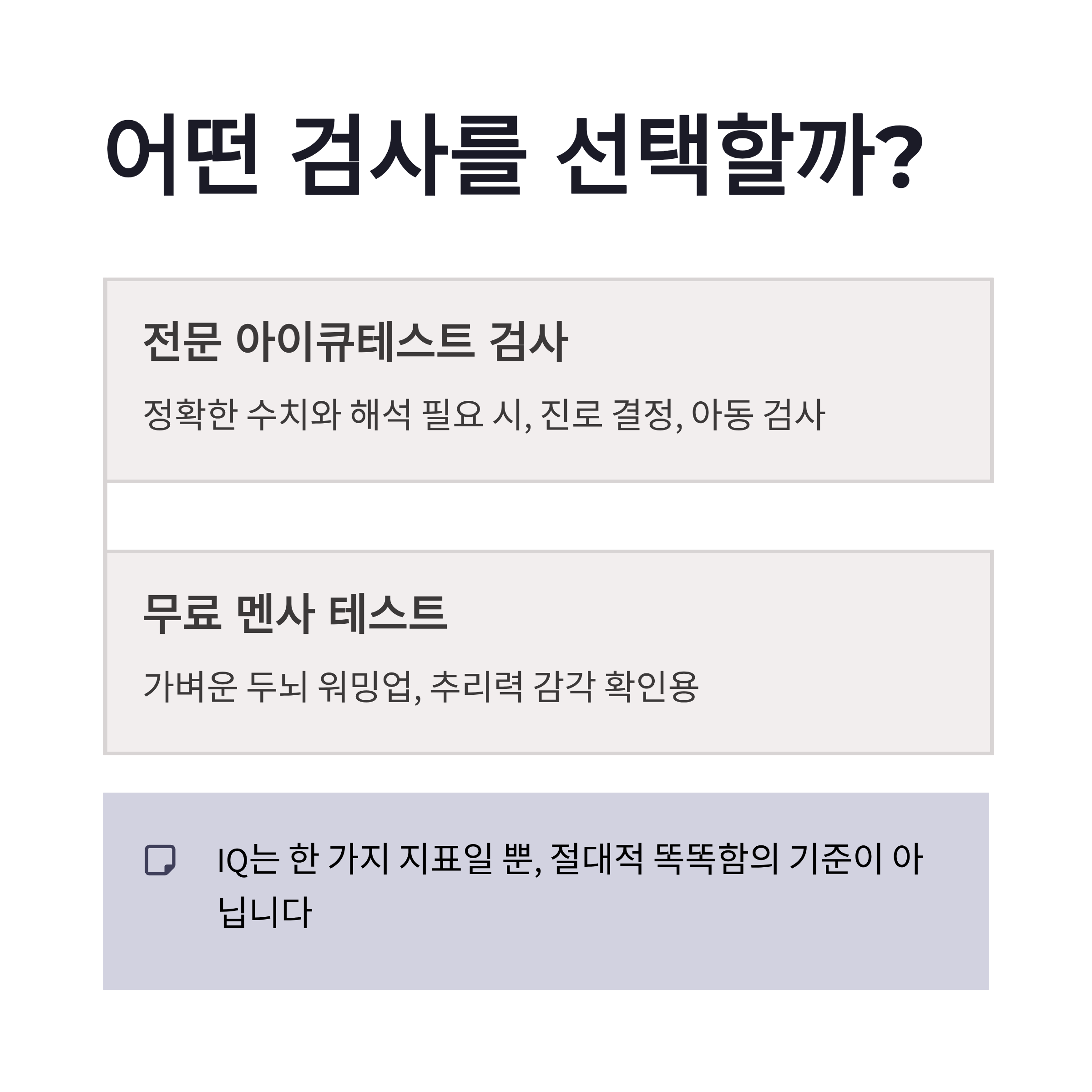 정리해보면 이렇습니다. 정확한 수치와 해석이 필요하다면 전문 아이큐테스트 검사를 선택하는 게 맞고, 가볍게 두뇌 워밍업 느낌으로는 무료 멘사 테스트도 괜찮습니다.