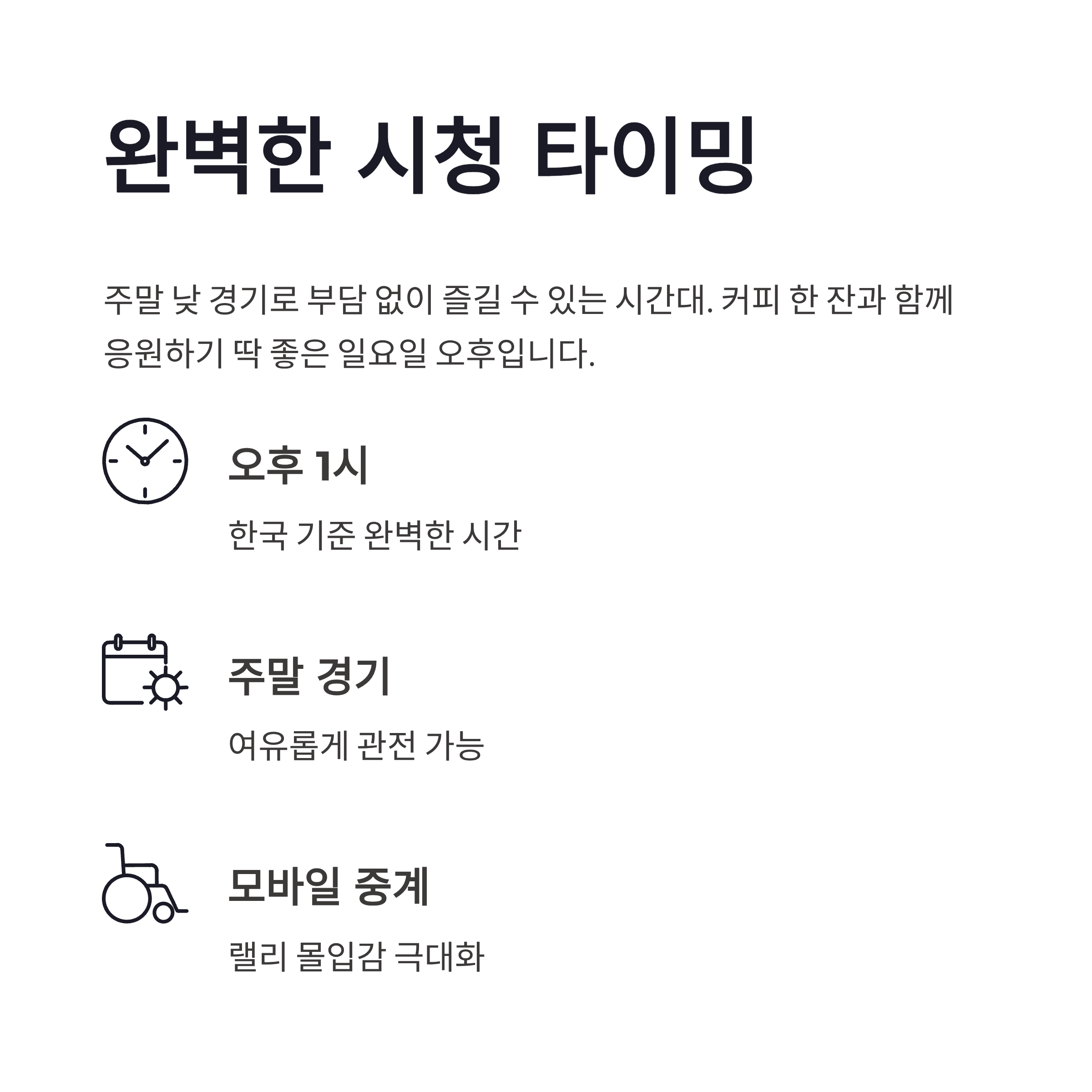 | 중계 시간 | 한국 기준 일요일 오후 1시 |