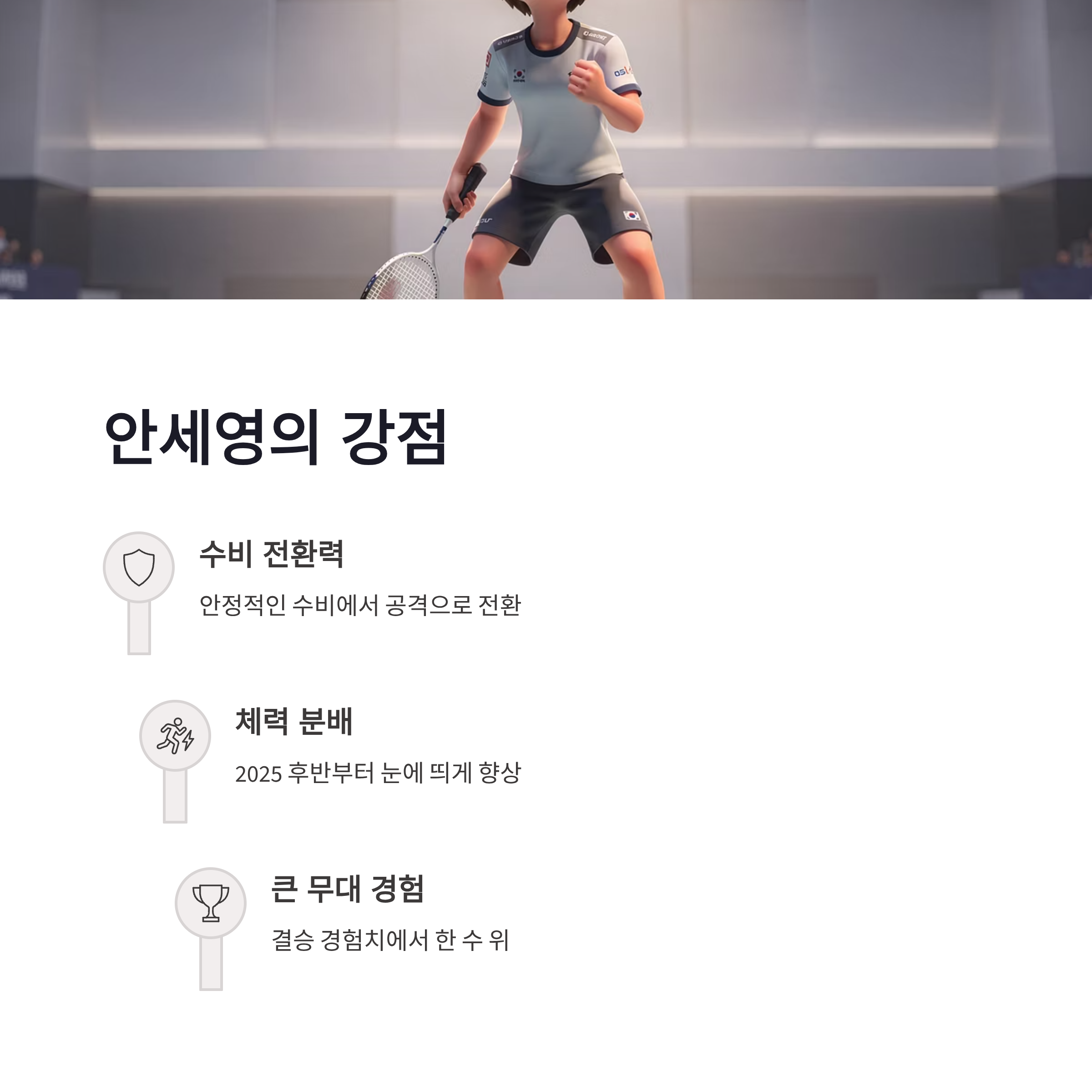 이번 안세영 결승전은 스타일 싸움이에요. 왕즈이는 공격 템포가 빠르고 각이 예리한 반면, 안세영은 수비 전환이 미쳤… 아니 정말 안정적입니다. 2025 시즌 후반부터 체력 분배가 눈에 띄게 좋아졌고요. 장점만 보면 안세영은 긴 랠리에서 유리, 왕즈이는 초반 기세 몰아치기. 단점이라면 안세영은 초반 실점 시 흐름이 잠깐 흔들릴 수 있고, 왕즈이는 실책이 연속으로 나올 때가 있더라구요. 그래도 큰 무대 경험치는 안세영 쪽이 한 수 위라고 느껴집니다.