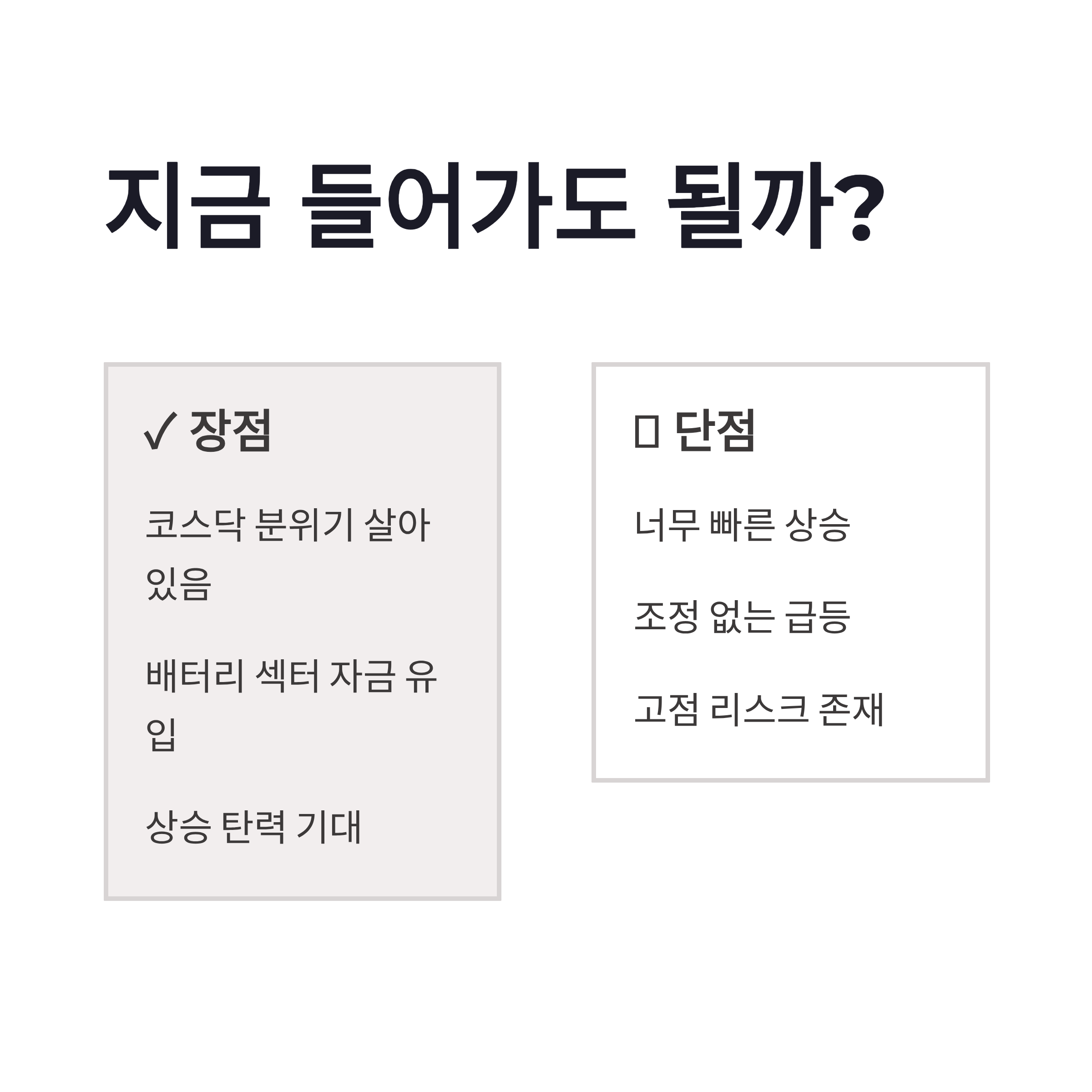 그럼 중요한 거. 지금 에코프로 주가, 들어가도 되나? 이거죠. 솔직히 말하면 장점도 있고, 단점도 분명합니다. 장점부터 보면, 코스닥 전체 분위기가 살아 있고, 배터리 섹터에 다시 자금이 도는 구간이라는 점. 이럴 땐 에코프로 주가가 상대적으로 더 탄력받기 쉬워요. 반대로 단점은… 너무 빠르게 올라왔다는 거 ㅠㅠ 조정 한 번 없이 쭉 가는 건 드물거든요. 그래서 지금은 “풀매수”보단, 분할 접근이나 눌림 체크가 현실적인 구간 같더라구요. 괜히 흥분해서 따라갔다가 손이 떨릴 수도 있겠쥬?