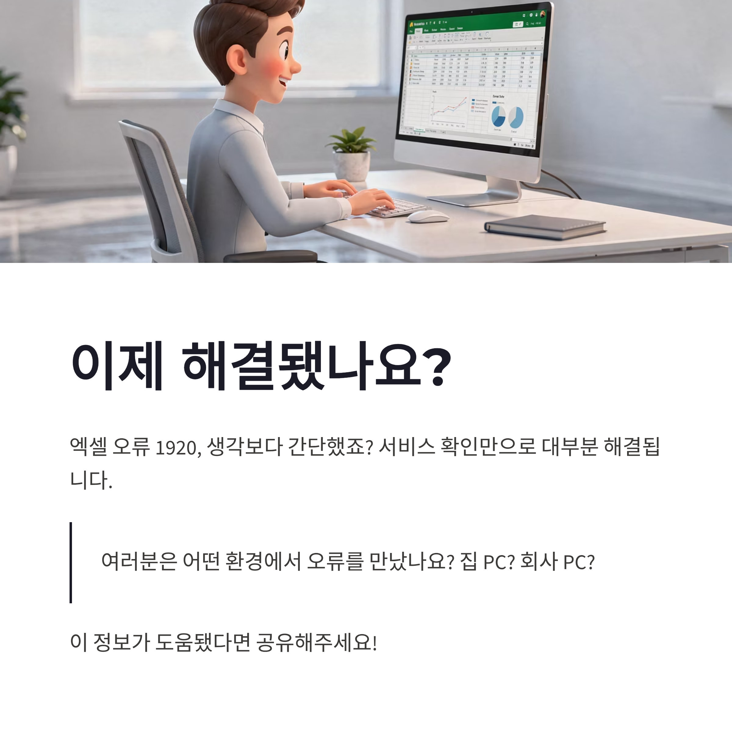 정리해보면 엑셀 오류 1920은 무서운 오류가 아니라, Windows 서비스 문제인 경우가 대부분이었구요. 서비스 실행 + 관리자 권한 설치만 해도 해결되는 경우가 정말 많았어요. 저처럼 재설치만 반복하지 말고, 한 번만 차분히 서비스부터 확인해보시길! 혹시 여러분은 어떤 상황에서 오류 1920이 떴나요? 집 PC였는지, 회사 PC였는지 궁금하네요 ㅎㅎ 엑셀 오류 1920, 이제는 조금 덜 무섭지 않나요?