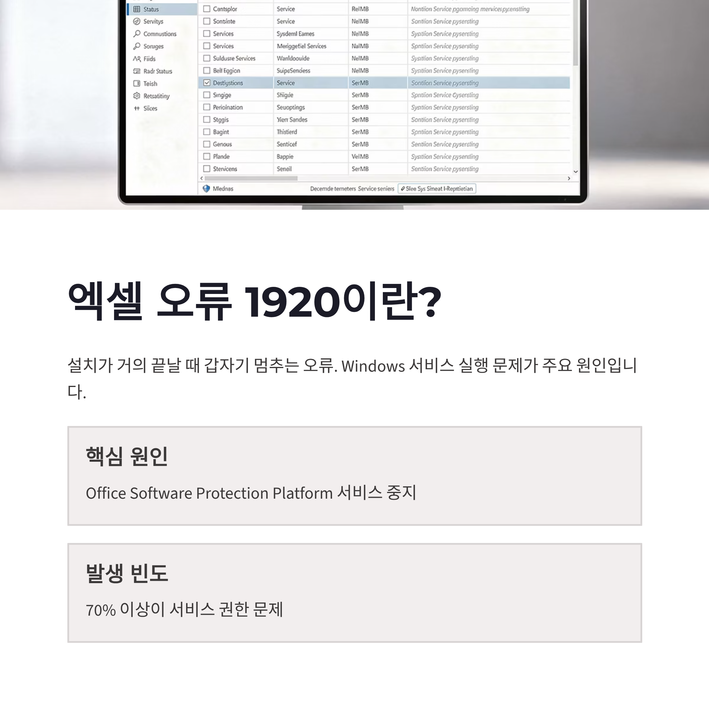 엑셀 오류 1920 처음 봤을 때 진짜 멍했구요… 설치가 거의 다 된 것 같은데 갑자기 멈추면서 오류 1920 딱 뜨면 멘탈 나가요 ㅠㅠ 이 엑셀 오류 1920은 엑셀만의 문제가 아니라 Microsoft Office 설치 중 특정 Windows 서비스가 실행되지 않을 때 발생하는 경우가 대부분이더라구요. 특히 Office Software Protection Platform(osppsvc), Windows Font Cache Service가 핵심 원인이에요. 2025년 기준으로 마이크로소프트 커뮤니티에서도 오류 1920의 70% 이상이 서비스 권한·중지 상태 문제라고 안내하고 있더라구요. 저도 확인해보니 서비스가 ‘중지됨’ 상태… 아 이거구나 싶었네요. 이런 시스템 오류는 겉으로는 복잡해 보여도, 하나씩 보면 생각보다 단순했어요. 엑셀 오류 1920, 이름만 무서운 녀석이었달까 ㅋㅋ