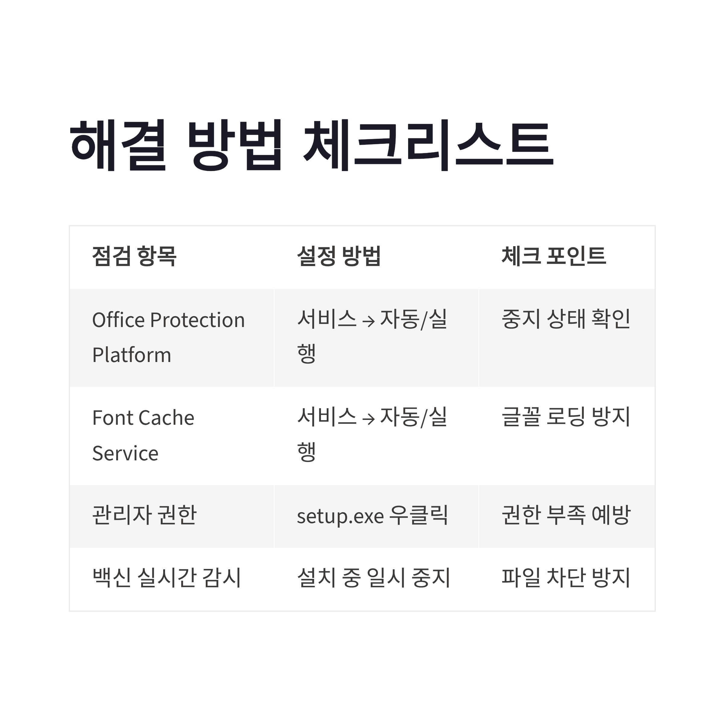 | Windows Font Cache Service | 서비스 → 자동 / 실행 | 글꼴 로딩 실패 방지 |