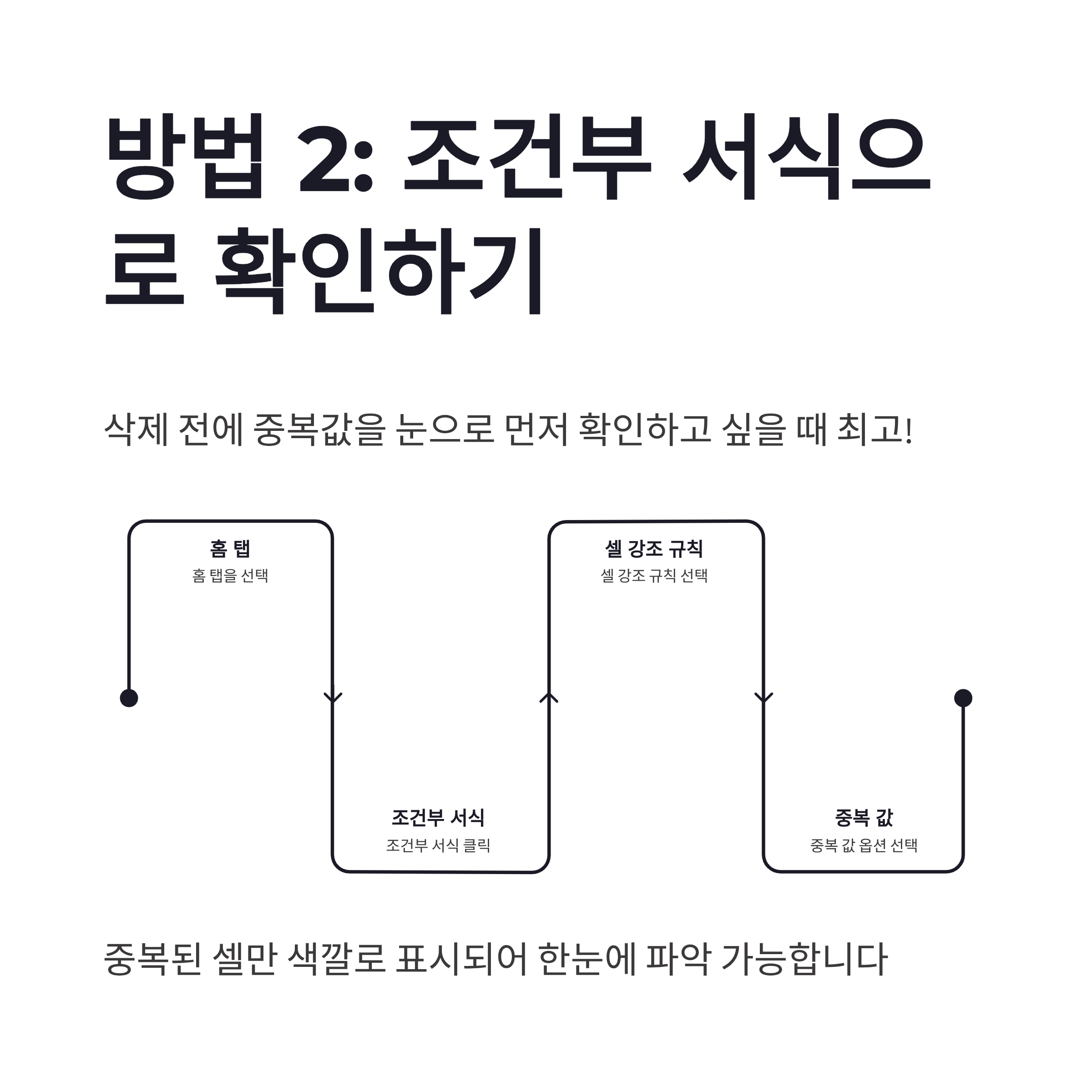 그래도 엑셀 중복값 찾기 목적이 정리냐, 확인이냐에 따라 선택하면 크게 문제 없었습니다. 상황에 맞게 쓰는 게 제일 중요하더라구요.