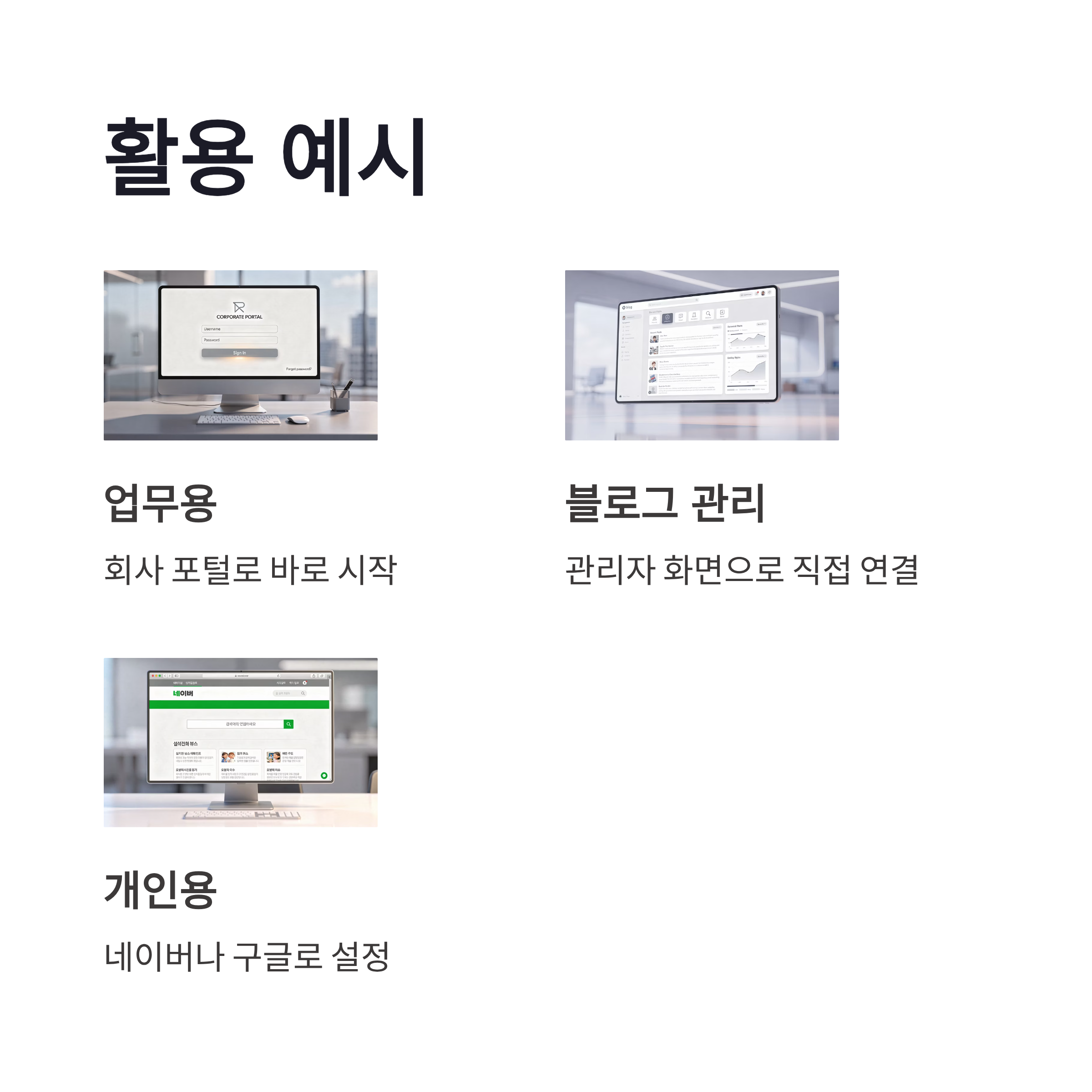 | 시작 페이지 | 브라우저 실행 시 첫 화면 | 네이버, 구글, 회사 포털 |