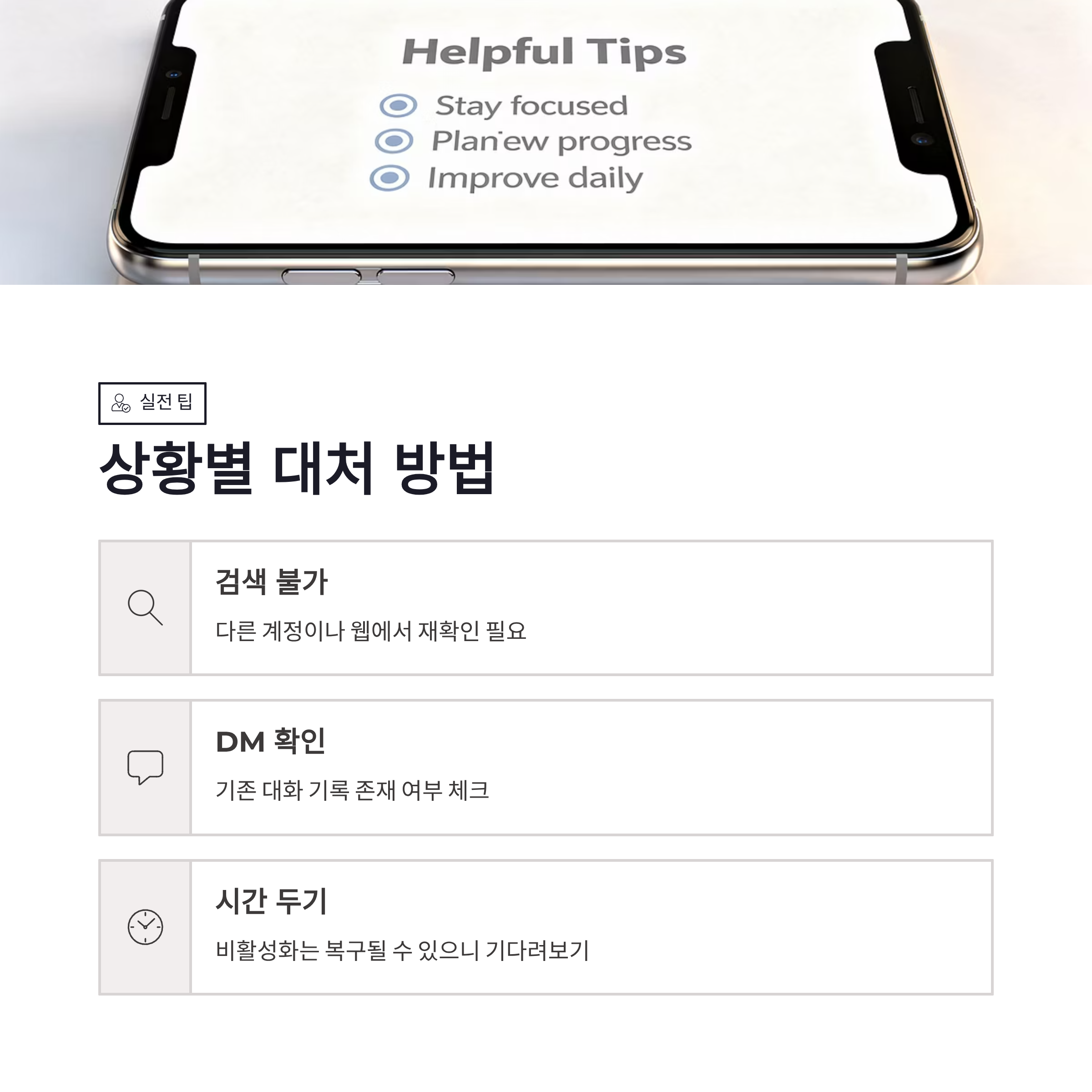 이 중에서 인스타그램 사용자 표시 + 기존 DM 기록만 남아있다? 이러면 삭제나 비활성화일 확률이 높았어요. 반대로 검색 자체가 안 되면 차단 가능성도 슬쩍 올라가구요.