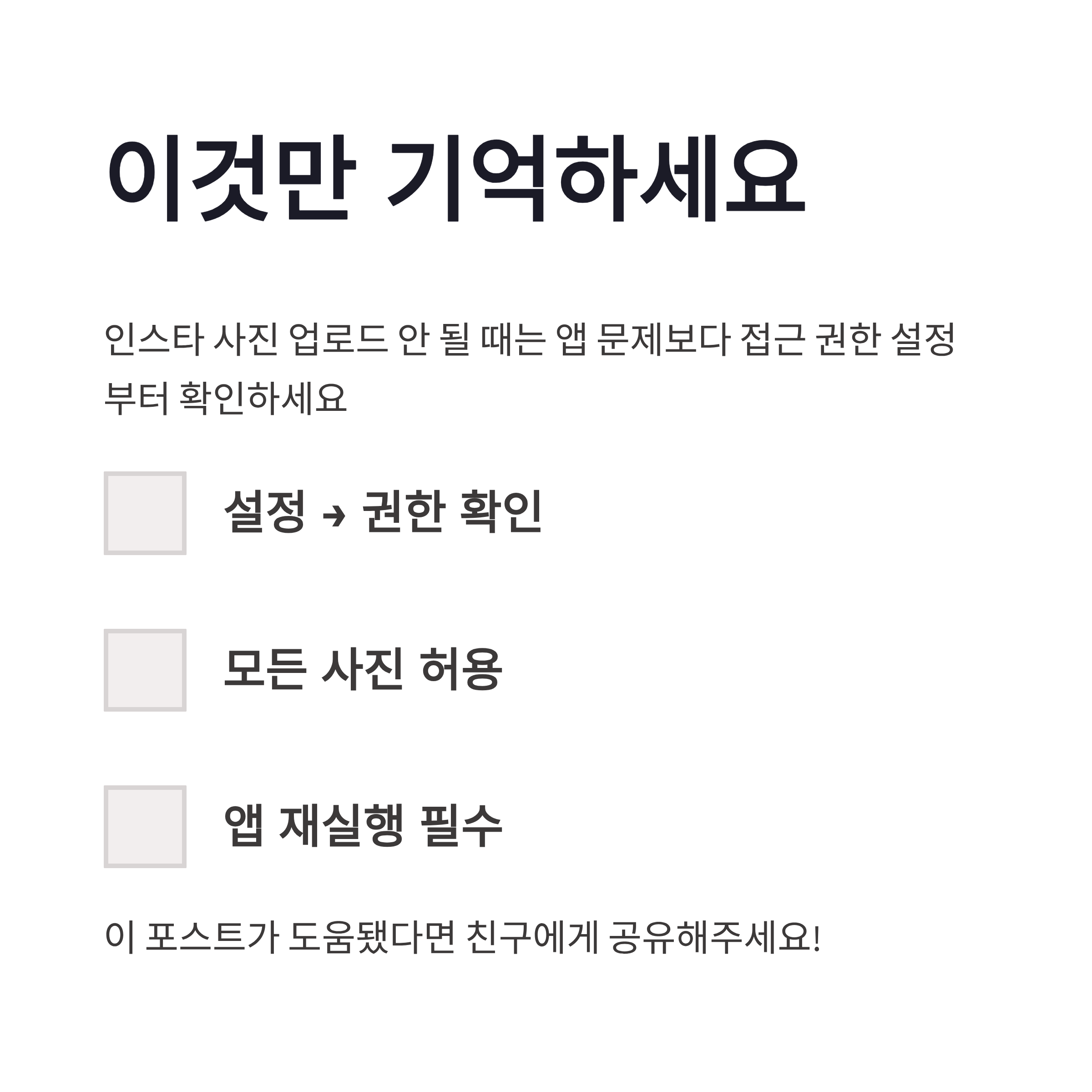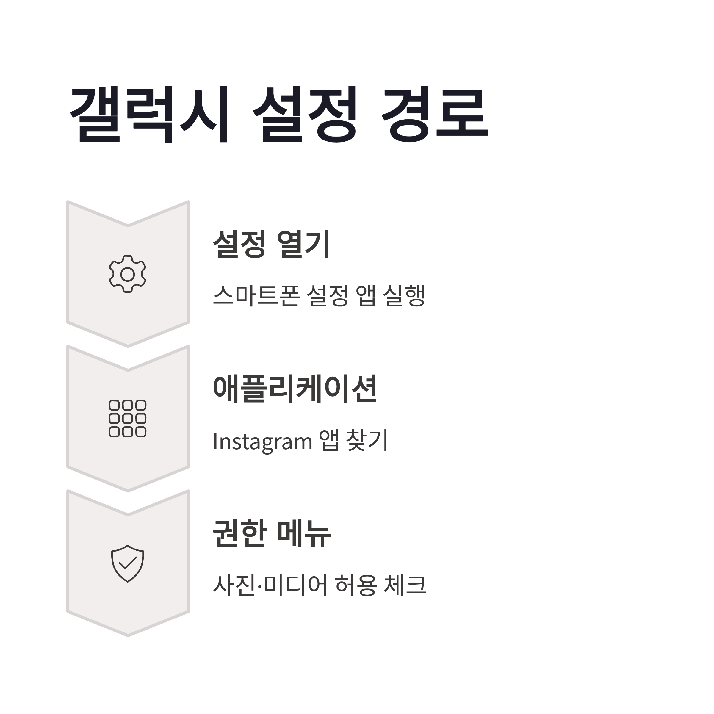 | 갤럭시(Android) | 설정 → 애플리케이션 → Instagram → 권한 | 사진·미디어 허용 상태인지 |