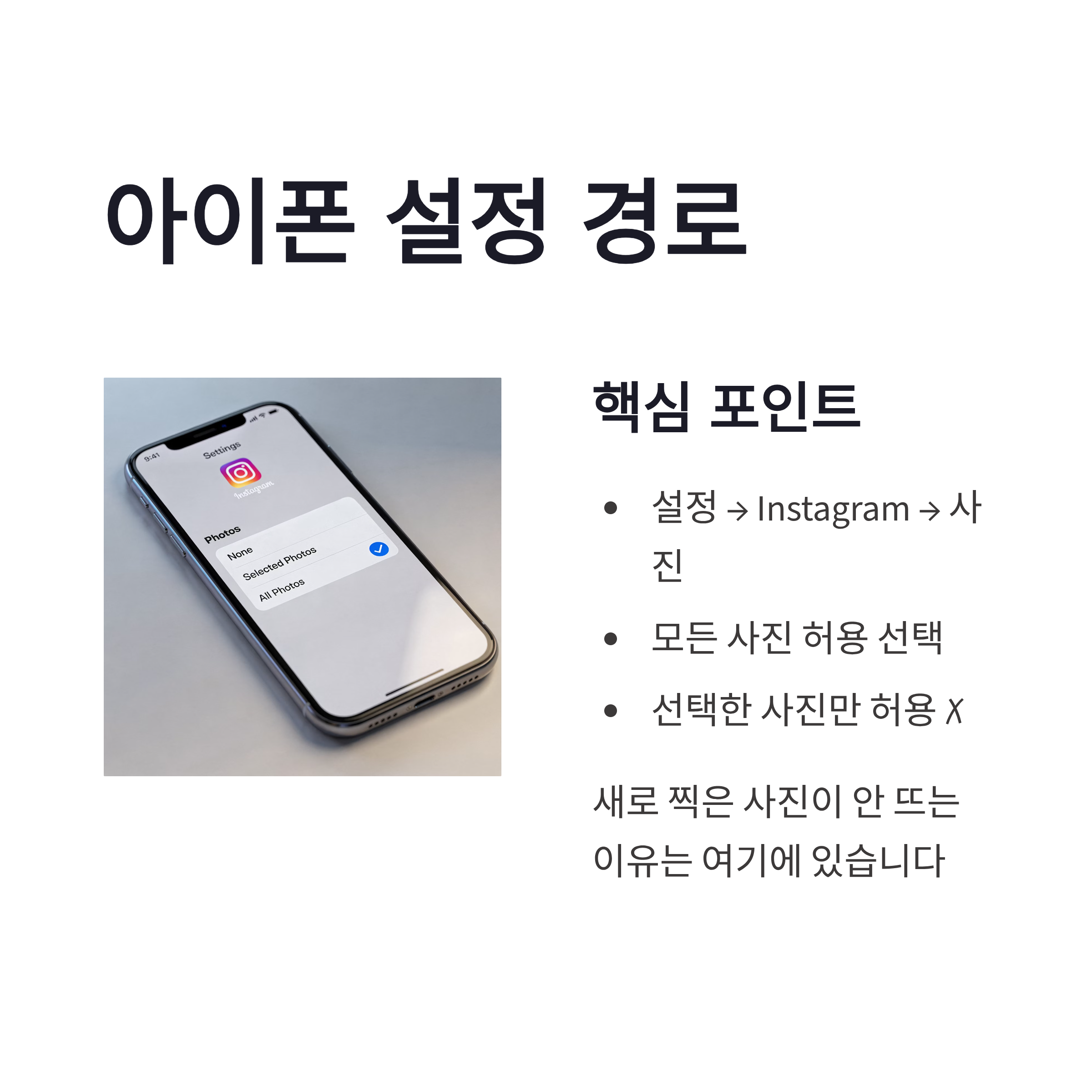 | 아이폰(iOS) | 설정 → Instagram → 사진 | 모든 사진 허용 선택 |