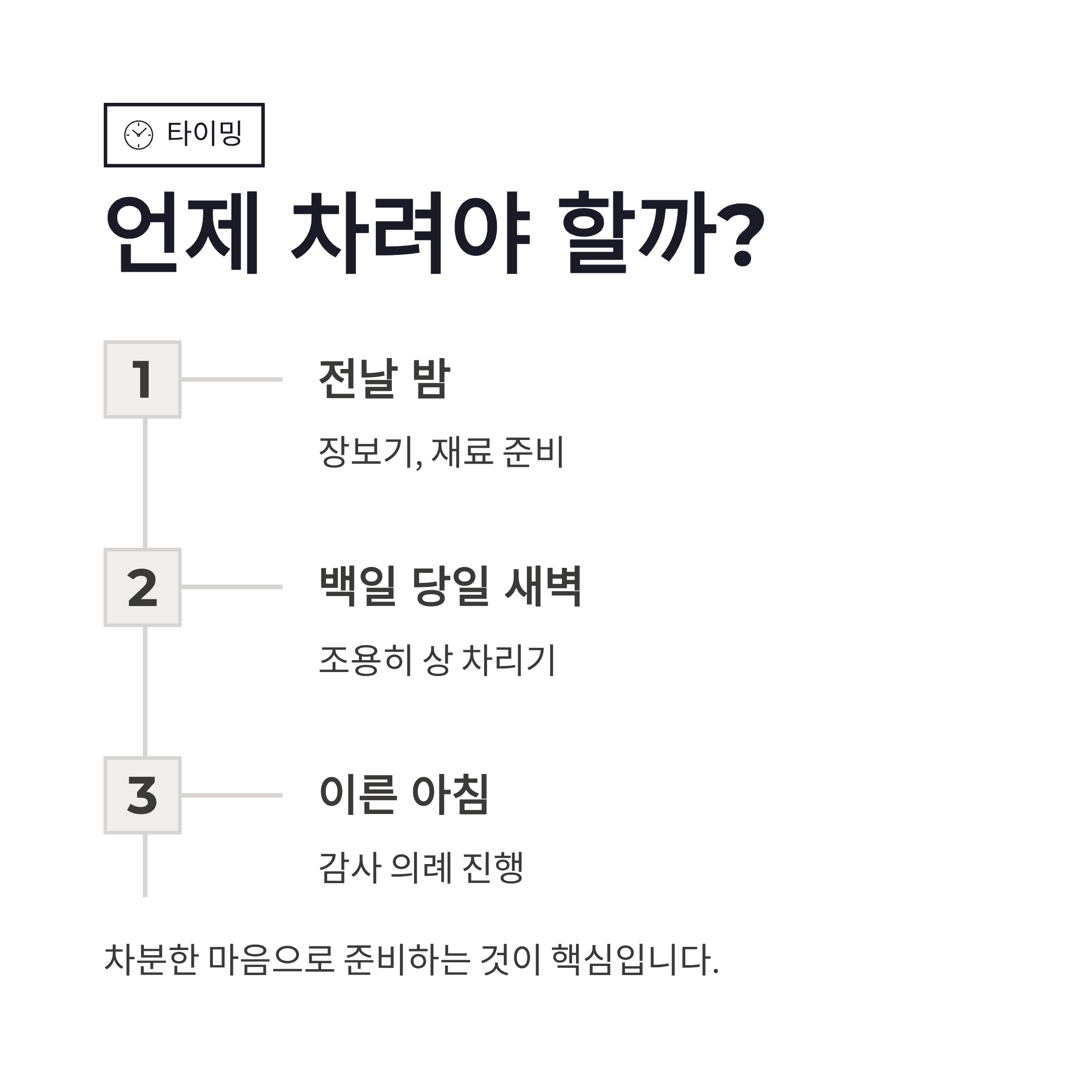 첫 아이 백일 준비하면서 제일 헷갈렸던 게 바로 삼신상이었어요. 백일상은 사진용, 삼신상은 감사용이라는 말 듣고 나서야 감이 오더라구요. 삼신상은 아이를 무사히 낳고 백일까지 키울 수 있게 도와준 존재에게 감사하는 상이라서, 화려함보다는 정성과 절차가 더 중요했어요. 언제 차리느냐도 중요한데, 보통 백일 당일 새벽이나 이른 아침에 준비합니다. 저도 전날 밤에 미리 장 봐두고 새벽에 조용히 차렸는데요, 괜히 마음이 더 차분해지더라구요. 처음엔 부담됐지만 막상 해보니 의미를 알고 차리는 게 핵심이었습니다.