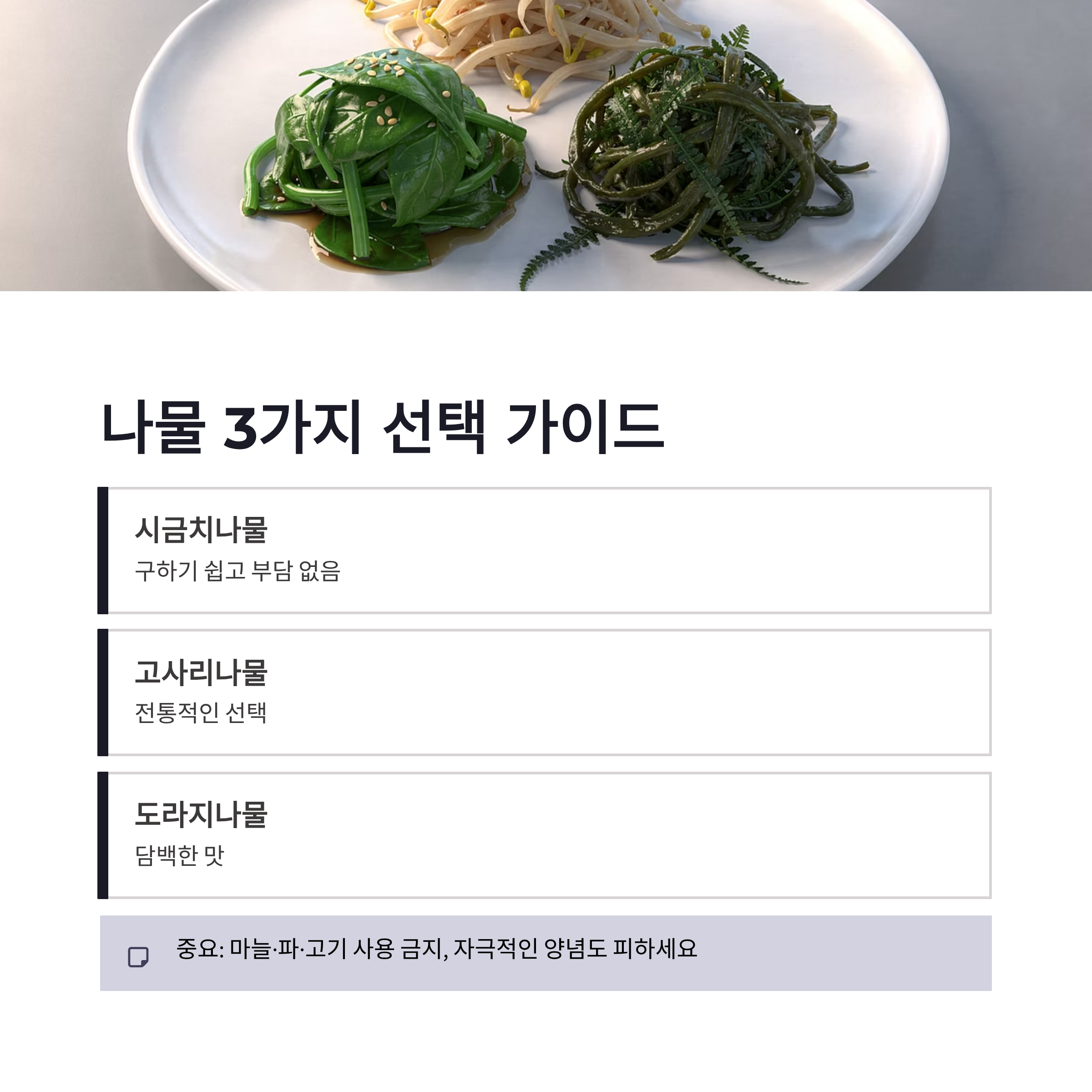 | 나물 | 3가지 | 시금치·고사리·도라지 |