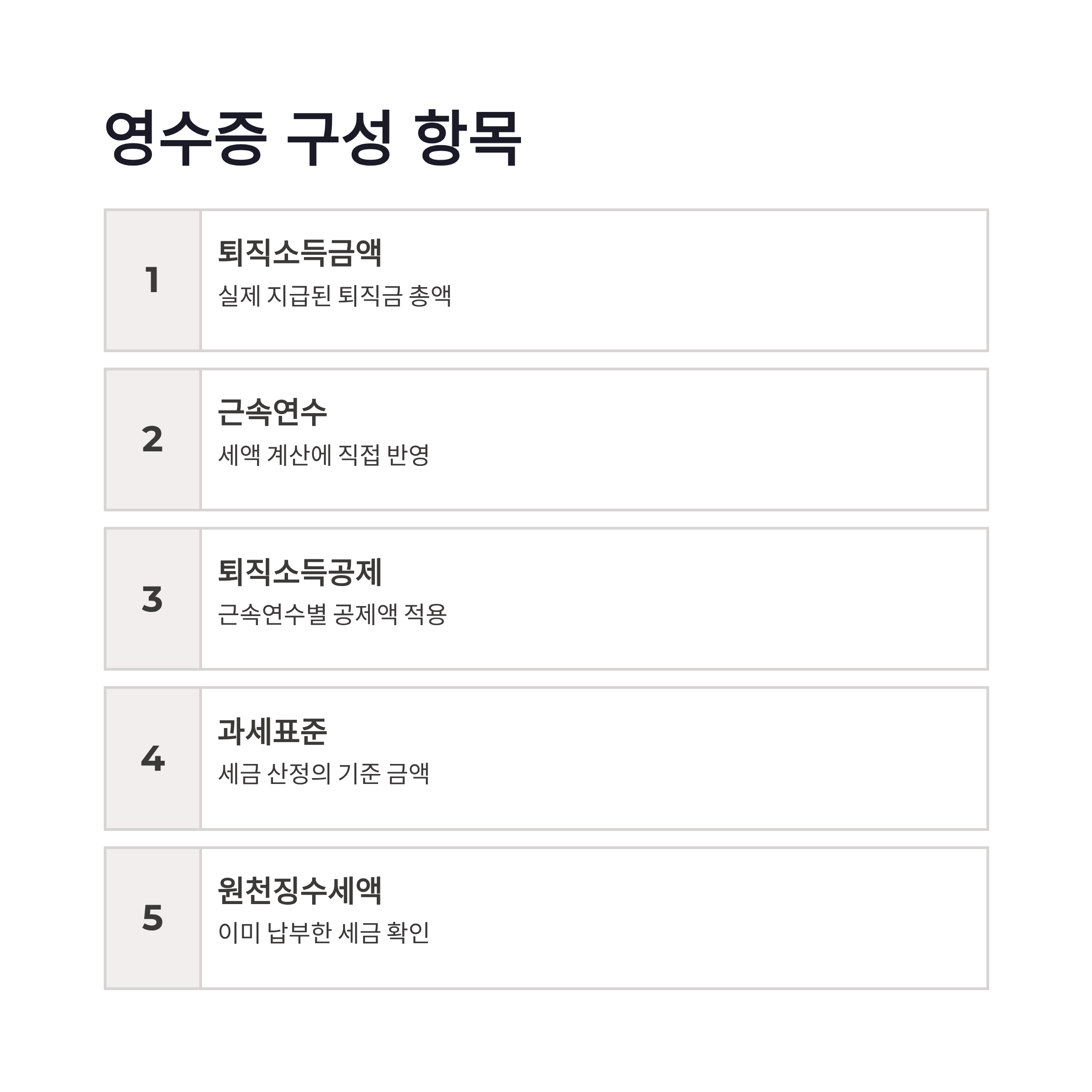 퇴직소득세 원천징수영수증 안을 열어보면 생각보다 디테일이 많습니다. 단순히 “세금 냈다” 수준이 아니었어요. 제가 실제로 확인했던 핵심 항목은 이렇습니다.
