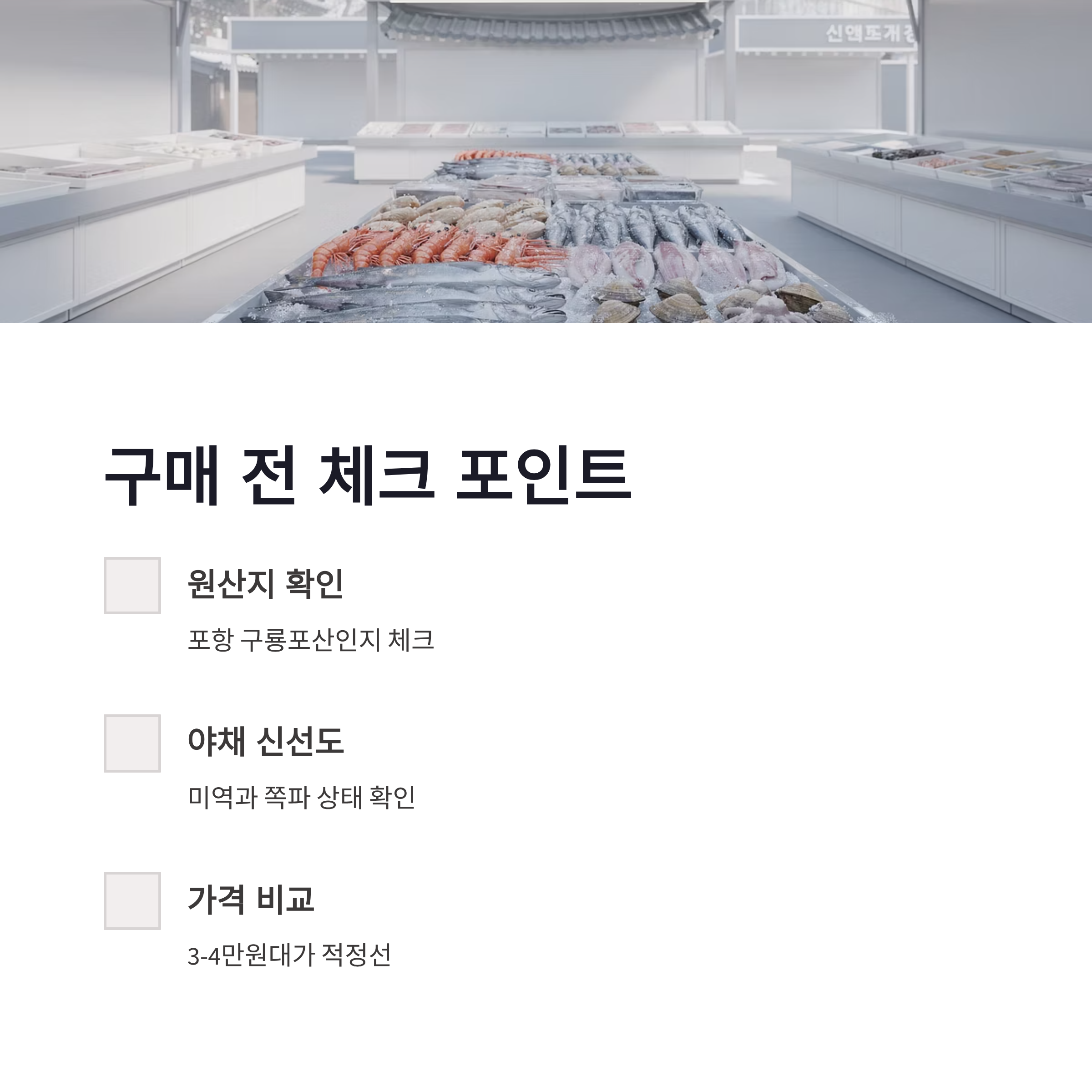 | 야채 | 미역·쪽파·마늘 | 싱싱함 유지 |