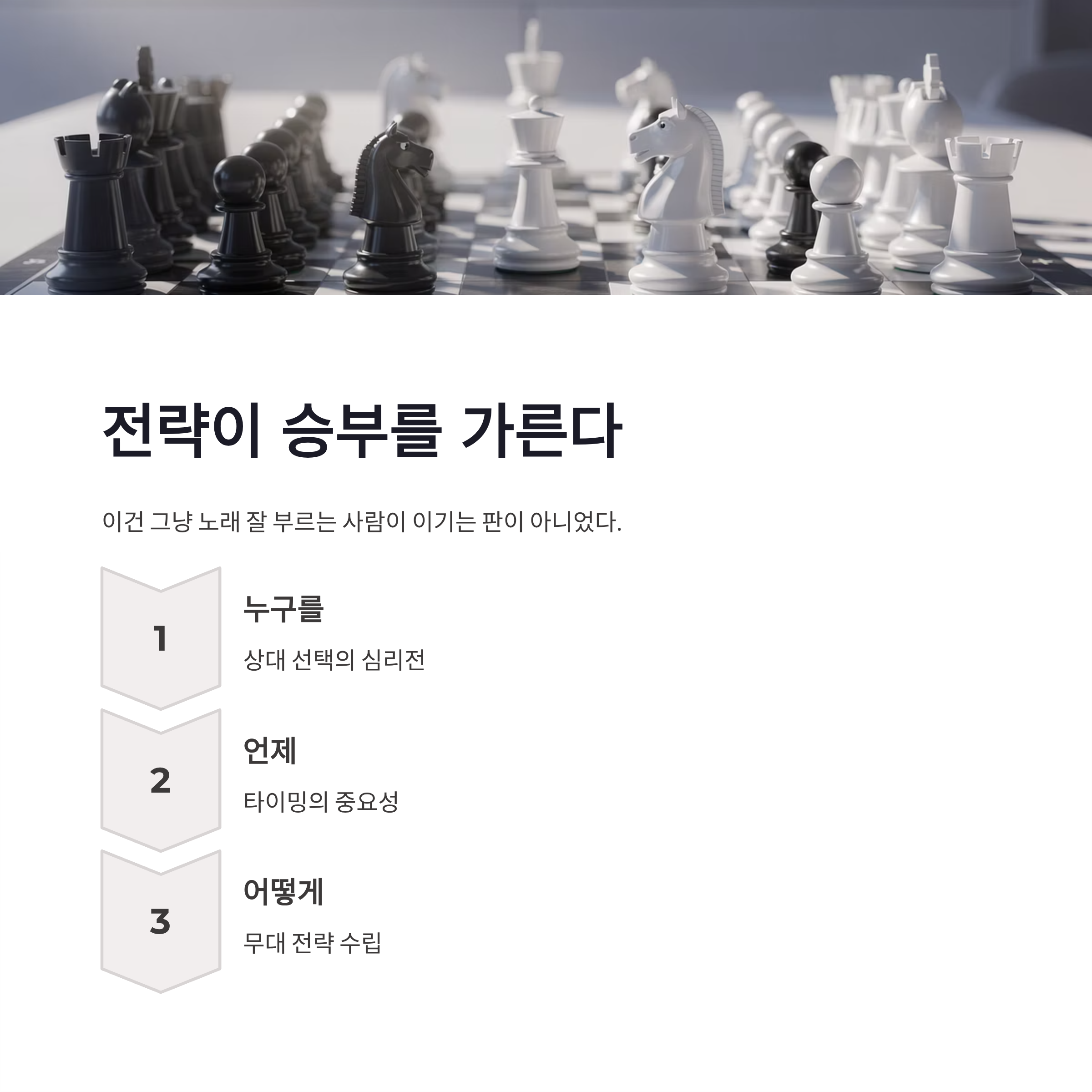 | 평가 기준 | 가창력+무대 장악 | 감정선 중요 |