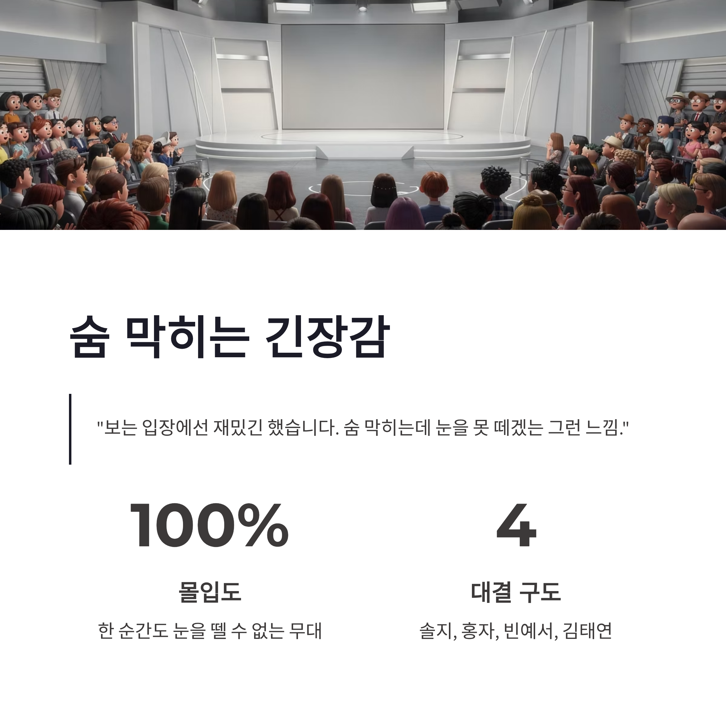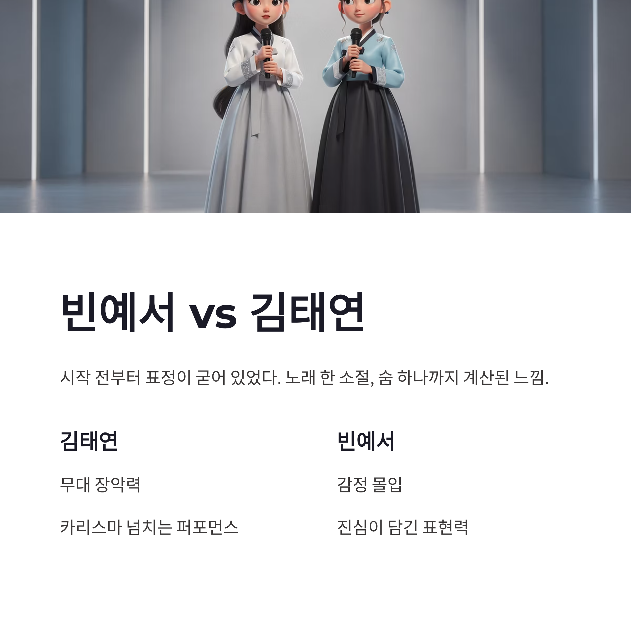 김태연은 무대 장악력이 진짜 무서웠고, 빈예서는 감정 몰입이 장점이었어요. 근데 이 룰 아래에서는 조금의 흔들림도 바로 티가 나더라구요. 현장에서 보는 사람도 이렇게 긴장되는데, 무대 위는 오죽했을까요… 아휴 ㅠㅠ