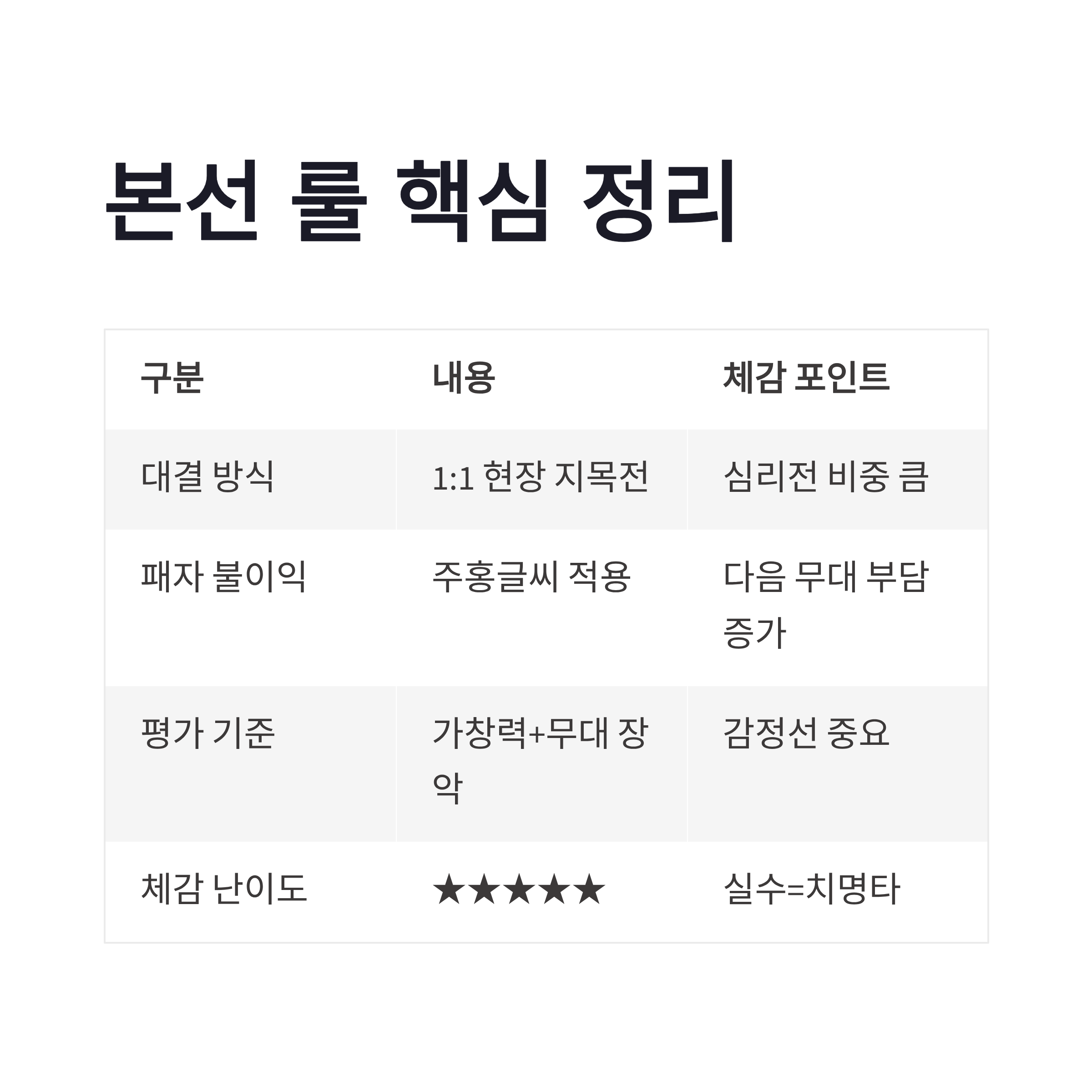 | 대결 방식 | 1:1 현장 지목전 | 심리전 비중 큼 |