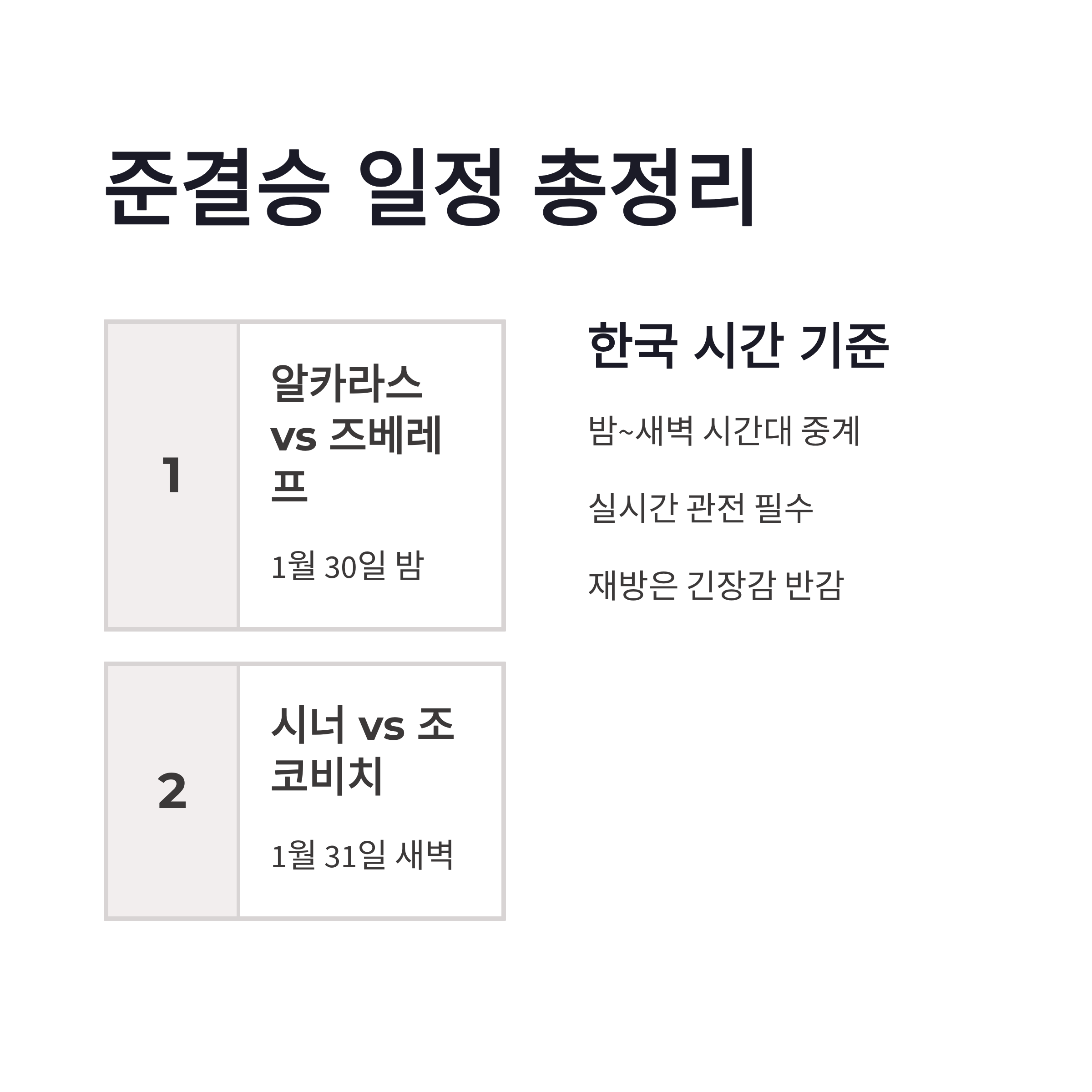 | 남자 준결승 2 | 시너 vs 조코비치 | 1월 31일 새벽 |