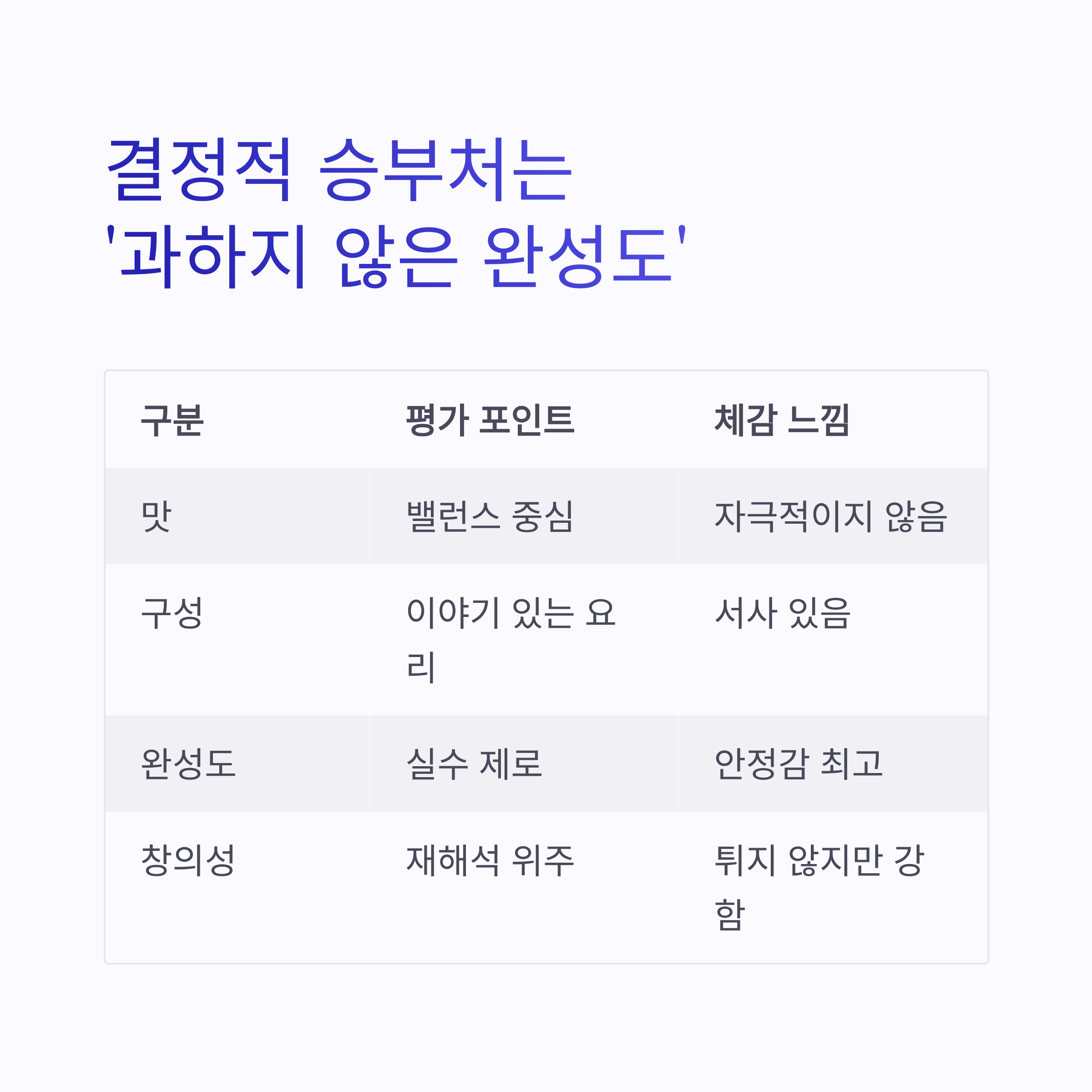 | 완성도 | 실수 제로 | 안정감 최고 |
