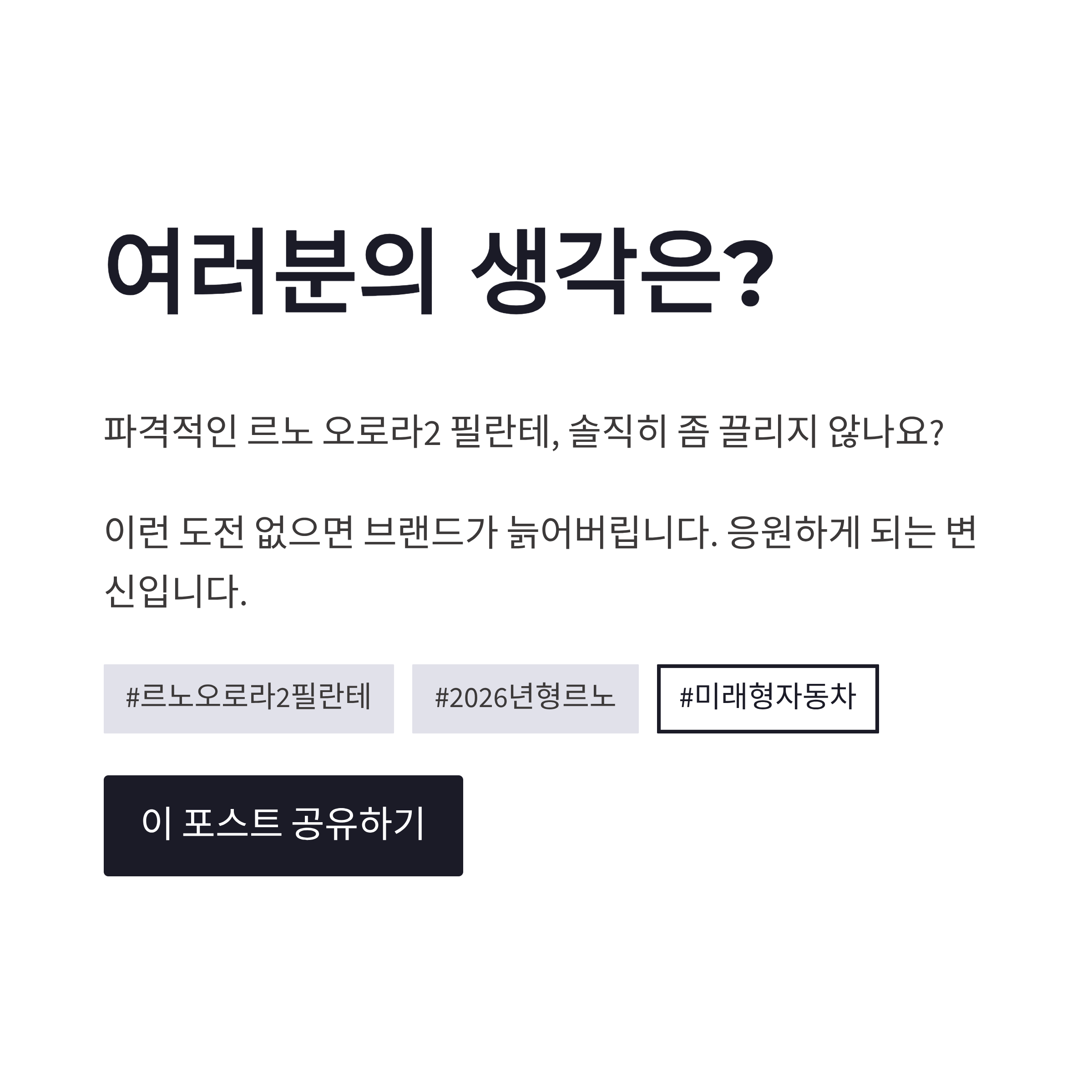 요즘 자동차 트렌드가 전기차, 미래지향 디자인으로 쏠리는 건 사실이죠. 그 흐름을 르노 오로라2 필란테가 제대로 탔다는 느낌입니다. 장점은 확실해요. 브랜드 이미지 리프레시, 젊은 층 어필, 글로벌 시장 노림수까지. 반대로 단점도 있죠. 기존 르노 감성을 좋아하던 분들에겐 “너무 튄다”는 반응도 많습니다. 안정감보단 실험적인 인상이 강하니까요. 그래도 이런 도전 없으면 브랜드가 늙어버리잖아요… 저는 이 도전, 꽤 응원하게 되더라구요.