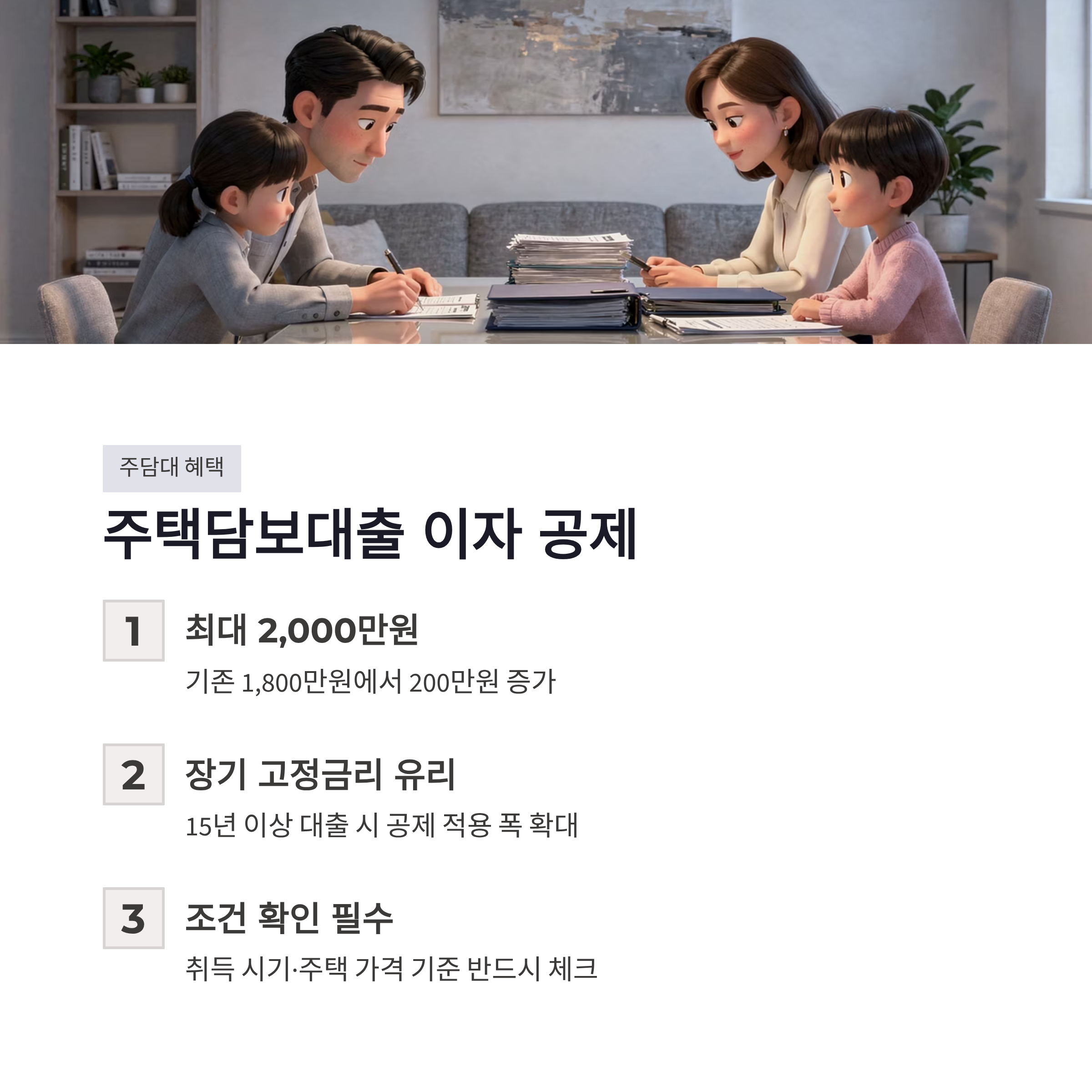 2026년 국세청 안내 기준으로 장기(15년 이상) 고정금리 대출은 공제 적용 폭이 더 넓게 설계돼 있습니다. 다만 조건은 그대로라서, 취득 시기·주택 가격 기준은 반드시 확인해야 하구요. 장점은 분명하지만 조건 안 맞으면 그냥 스쳐 지나가는 혜택이라 살짝 아쉽기도 했습니다 ㅠㅠ