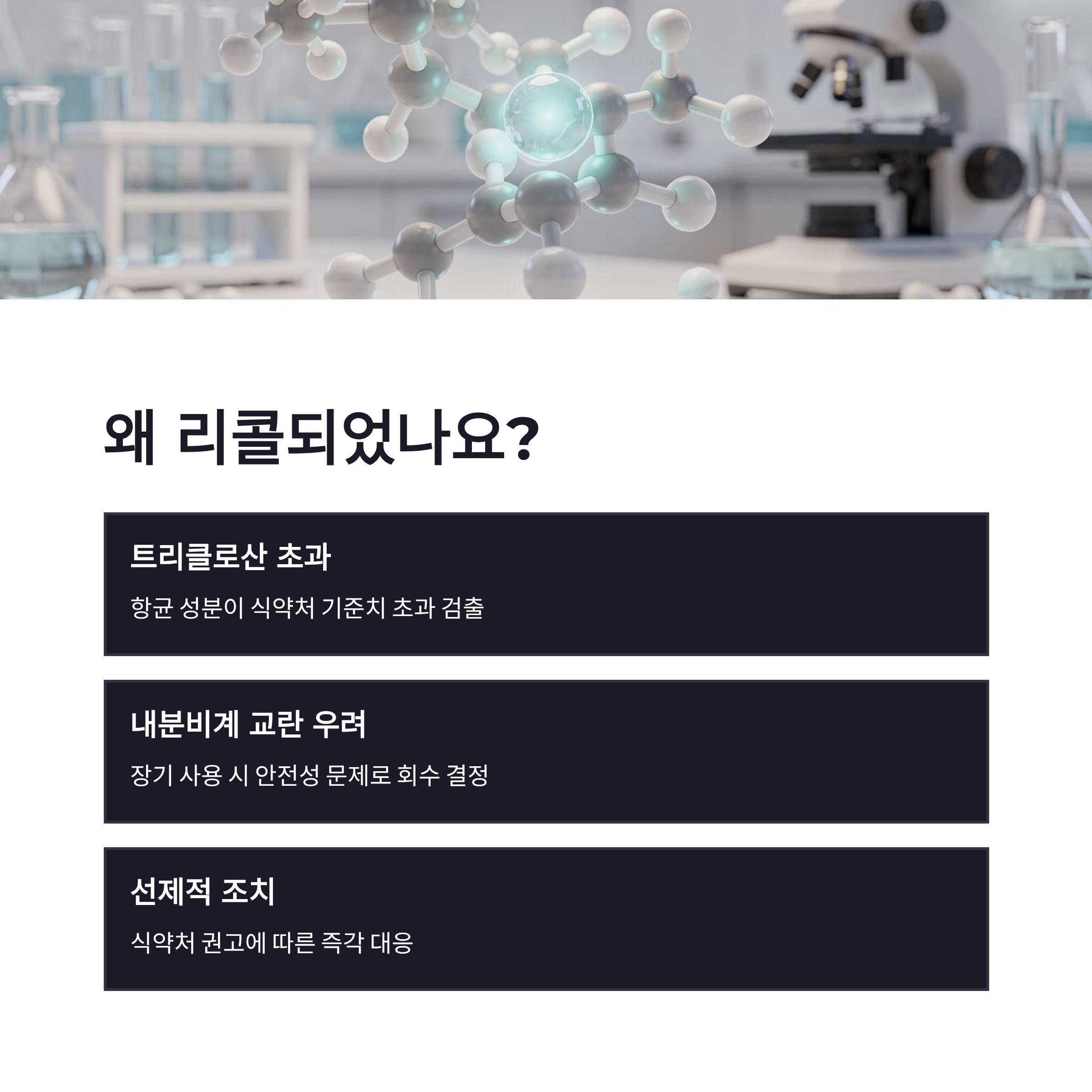 이번 2080 치약 리콜은 특정 한두 개가 아니라, 총 6종 제품이 한 번에 포함됐다는 점이 핵심이에요. 문제 성분인 트리클로산은 항균 효과 때문에 과거엔 흔히 쓰였지만, 최근에는 내분비계 교란 가능성 때문에 사용 기준이 엄격해졌거든요. 식약처 발표 기준으로 보면, 해당 제품들은 사용해도 즉각적인 위험이 크다고 단정하긴 어렵지만, 장기 사용 시 안전성 우려 때문에 선제적으로 회수 조치가 내려진 상태입니다. 개인적으로는 “에이 괜찮겠지” 했다가 나중에 후회할까 봐 바로 확인부터 했어요. 이럴 땐 조심해서 나쁠 거 없더라구요.