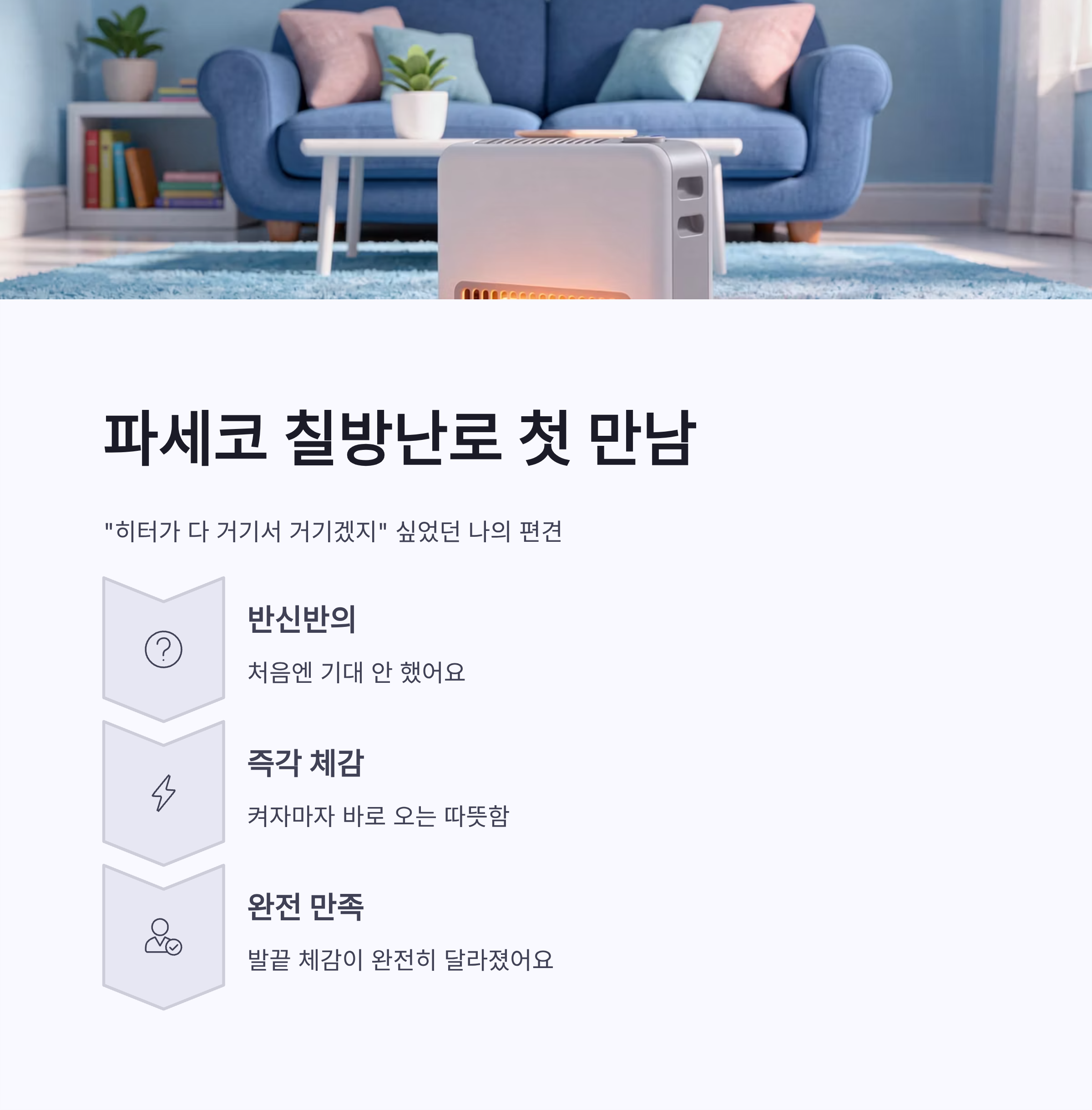겨울 아침마다 이불 속에서 파세코 전기히터 생각만 하게 되더라구요. 발이 시리면 하루 시작부터 이미 패배한 느낌 ㅠㅠ 난방은 켰는데 방 구석은 여전히 냉골, 그렇다고 보일러 더 틀자니 전기요금이 무섭고요. 그래서 들인 게 파세코 전기히터 칠방난로였는데요. 솔직히 처음엔 “히터가 다 거기서 거기겠지” 싶었는데, 막상 써보니 발끝 체감이 완전 달랐어요. 켜자마자 바로 오는 따뜻함 덕분에 출근 준비가 훨씬 수월해졌고, 작은 공간 난방엔 딱이더라구요. 발터치 기능도 은근 편해서 아침에 허리 숙일 일 줄어든 것도 포인트였구요.