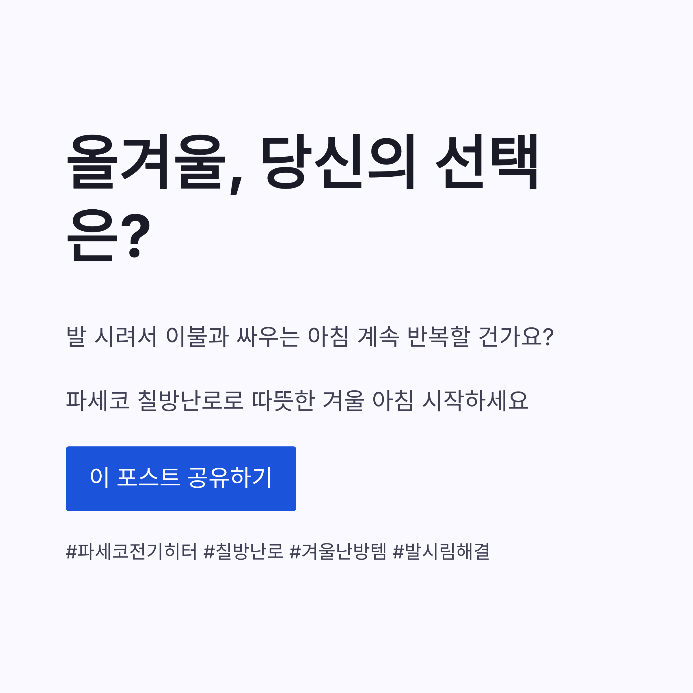 정리하자면, 파세코 전기히터 칠방난로는 발시림 때문에 겨울이 싫었던 분들한테 딱 맞는 선택 같아요. 빠른 체감 난방, 조용함, 발터치 편의성까지 실사용 만족도가 높았구요. 저처럼 아침 준비 시간 짧게 쓰거나, 사무실 개인 난방기 찾는 분들한테 특히 추천하고 싶어요. 올겨울, 발 시려서 이불과 싸우는 아침… 계속 반복할 건가요? 저는 파세코 전기히터 덕분에 그 싸움 끝냈는데요 ㅎㅎ 여러분 선택은 어떠신지 궁금하네요.