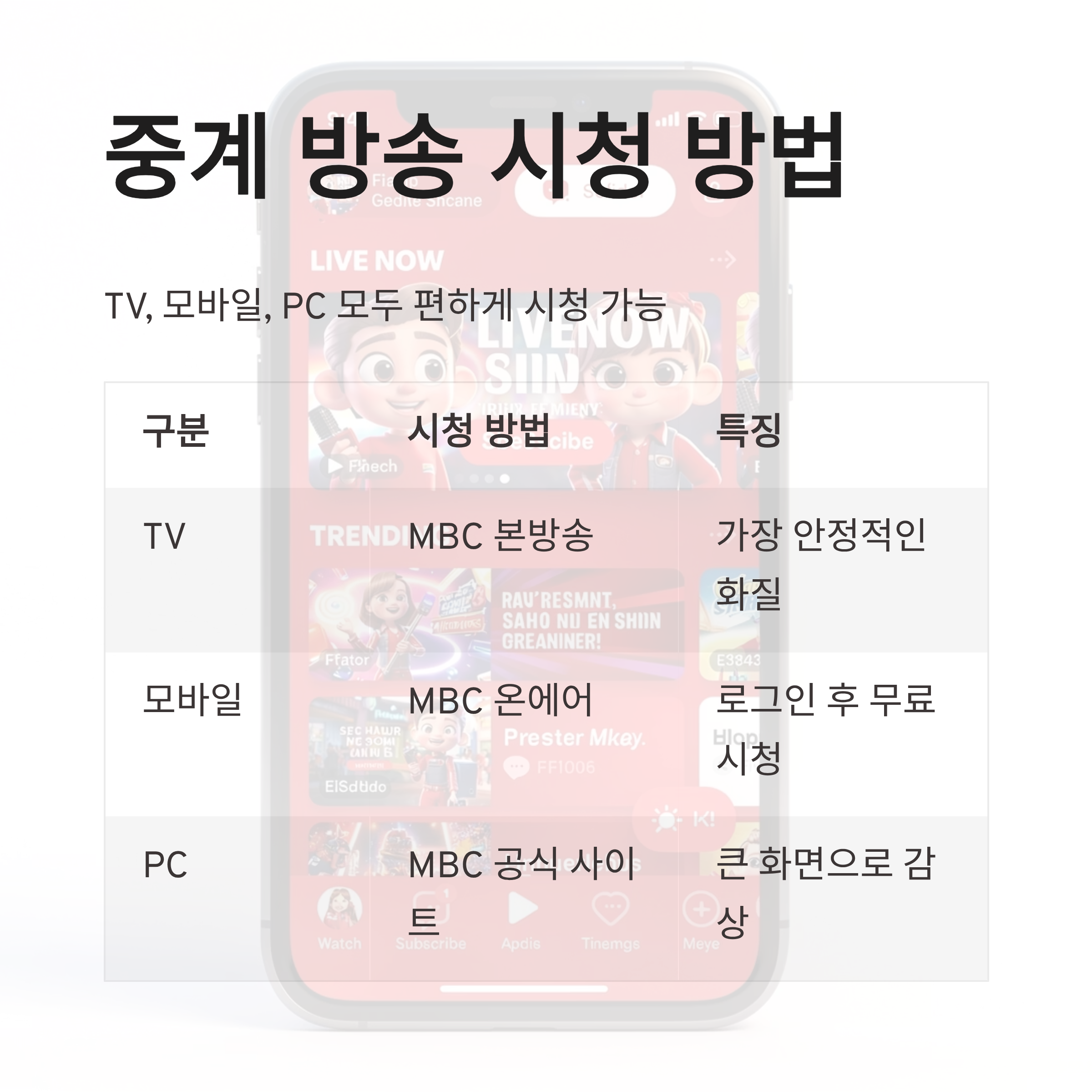 집에서 편하게 2025 MBC 가요대제전 중계 보는 방법은 생각보다 단순합니다. TV로는 MBC 본방을 켜두면 되고, 외출 중이거나 모바일 시청이라면 MBC 공식 온에어를 이용하면 돼요. 저도 작년엔 밖에서 모바일로 봤는데 화질도 생각보다 괜찮아서 놀랐습니다 ㅎㅎ 아래 표로 한 번에 정리해볼게요.